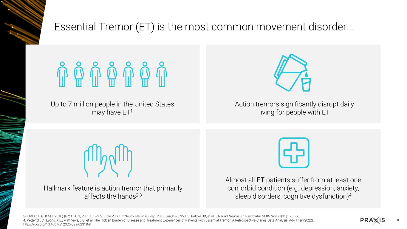 8 2H 2023 ET Phase 3 Initiation June 2023 ET End-of-Phase 2 FDA Meeting Ulixacaltamide (PRAX-944) Essential Tremor and Parkinson’s Disease KEY UPCOMING MILESTONES