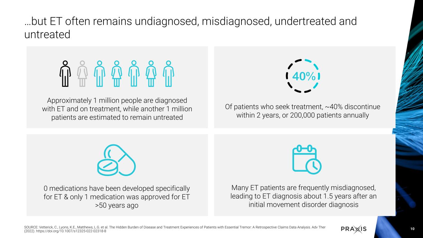 10 Approximately 1 million people are diagnosed with ET and on treatment, while another 1 million patients are estimated to remain untreated 0 medications have been developed specifically for ET & only 1 medication was approved for ET >50 years ago Of patients who seek treatment, ~40% discontinue within 2 years, or 200,000 patients annually …but ET often remains undiagnosed, misdiagnosed, undertreated and untreated SOURCE: Vetterick, C., Lyons, K.E., Matthews, L.G. et al. The Hidden Burden of Disease and Treatment Experiences of Patients with Essential Tremor: A Retrospective Claims Data Analysis. Adv Ther (2022). https://doi.org/10.1007/s12325-022-02318-8 Many ET patients are frequently misdiagnosed, leading to ET diagnosis about 1.5 years after an initial movement disorder diagnosis 40%