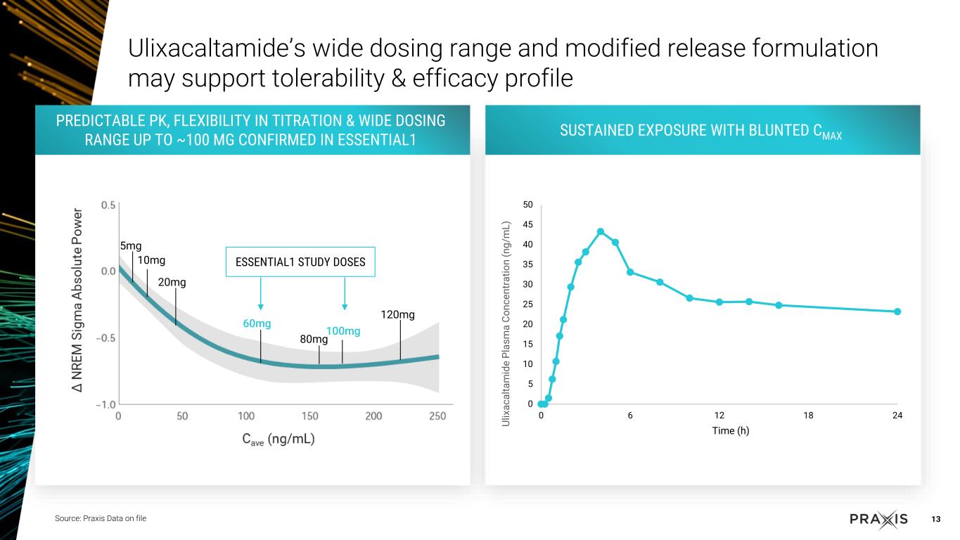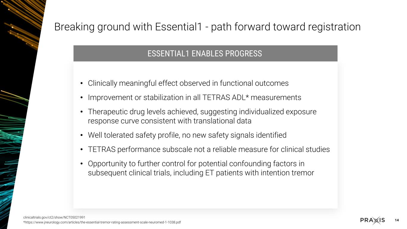 13 Ulixacaltamide’s wide dosing range and modified release formulation may support tolerability & efficacy profile Source: Praxis Data on file 0 5 10 15 20 25 30 35 40 45 50 0 6 12 18 24 Ul ix ac al ta m id e Pl as m a Co nc en tr at io n (n g/ m L) Time (h) SUSTAINED EXPOSURE WITH BLUNTED CMAX Source: Praxis Data on file PREDICTABLE PK, FLEXIBILITY IN TITRATION & WIDE DOSING RANGE UP TO ~100 MG CONFIRMED IN ESSENTIAL1 5mg 10mg 20mg 60mg 80mg 100mg 120mg ESSENTIAL1 STUDY DOSES