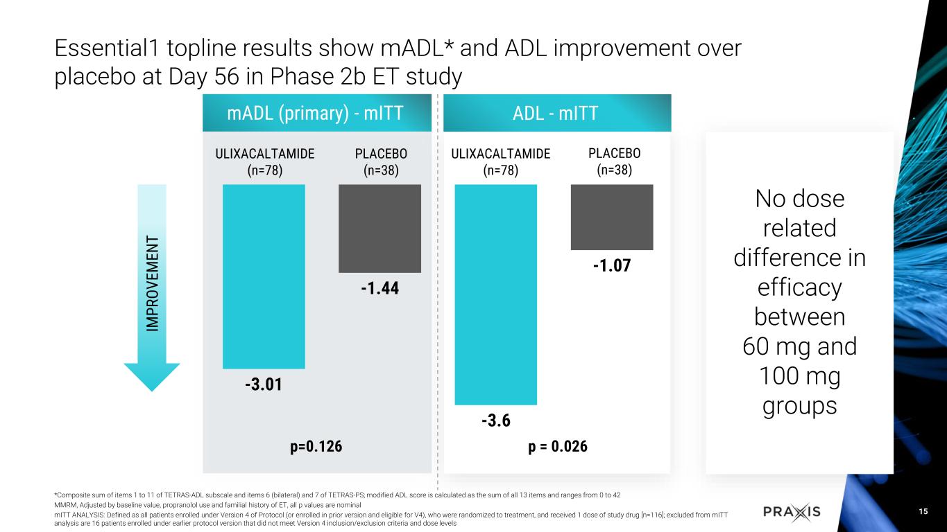 14 • Clinically meaningful effect observed in functional outcomes • Improvement or stabilization in all TETRAS ADL* measurements • Therapeutic drug levels achieved, suggesting individualized exposure response curve consistent with translational data • Well tolerated safety profile, no new safety signals identified • TETRAS performance subscale not a reliable measure for clinical studies • Opportunity to further control for potential confounding factors in subsequent clinical trials, including ET patients with intention tremor Breaking ground with Essential1 - path forward toward registration ESSENTIAL1 ENABLES PROGRESS clinicaltrials.gov/ct2/show/NCT05021991 *https://www.jneurology.com/articles/the-essential-tremor-rating-assessment-scale-neuromed-1-1038.pdf