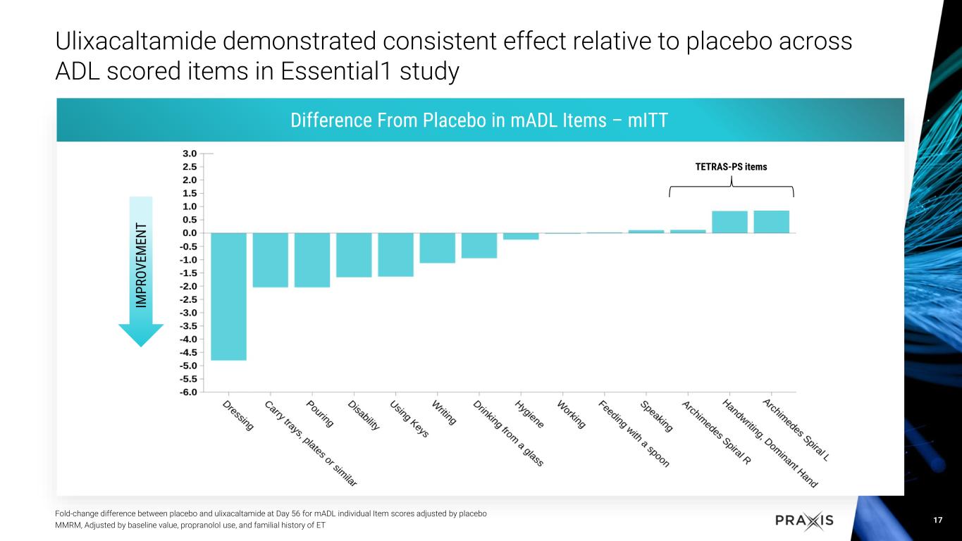 16 -30 -25 -20 -15 -10 -5 0 5 10 15 More patients taking ulixacaltamide showed improvements in ADL scores compared to patients on placebo in Essential1 study Observed ADL Change - mITTObserved mADL Change - mITT -30 -25 -20 -15 -10 -5 0 5 10 15 CH AN GE IN M AD L SC OR E AT D AY 5 6 More daily functions restored ULIXACALTAMIDE PLACEBO CH AN GE IN A DL S CO RE A T DA Y 56 ULIXACALTAMIDE PLACEBO
