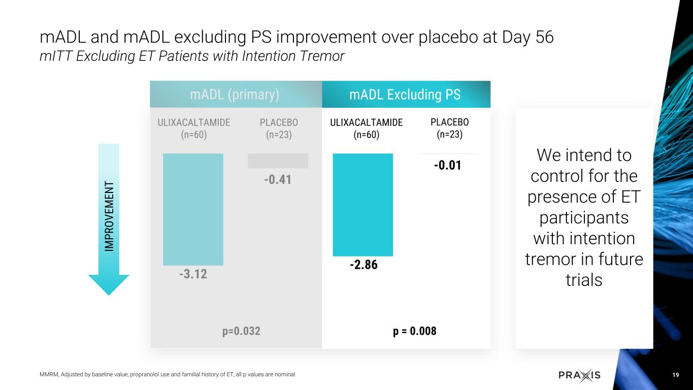 18 Ulixacaltamide demonstrated improvement over placebo in the mADL excluding PS at Day 56 in Essential1 study MMRM, Adjusted by baseline value, propranolol use and familial history of ET, all p values are nominal -3.01 -1.44 -2.69 -0.88 -3.6 -1.07 p=0.126 ULIXACALTAMIDE (n=78) ULIXACALTAMIDE (n=78) PLACEBO (n=38) PLACEBO (n=38) p = 0.026 mADL (primary) - mITT mADL Excluding PS - mITT ADL - mITT ULIXACALTAMIDE (n=78) PLACEBO (n=38) p = 0.042 IM PR OV EM EN T