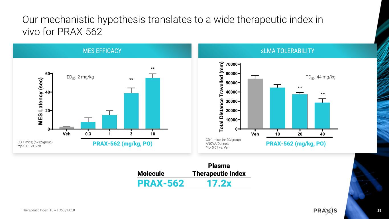 24 % INHIBITION OF hNaV1.6 PERSISTENT INa COMPARISON OF POTENCY AND SELECTIVITY Broader in vitro panel indicates PRAX-562 has best-in-class preferences 0.01 0.1 1 10 100 1000 10000 0 20 40 60 80 100 Concentration (µM) % In hi bi tio n Carbamazepine Lamotrigine Cenobamate PRAX-562 Persistent INa IC50 (nM) Ratio of persistent to peak inhibition PRAX-562 141 60 Carbamazepine 77,520 30 Cenobamate 73,263 23 Lidocaine 68,230 19 Lamotrigine 78,530 16 Vixotrigene (BIIB074) 3,676 14 Lacosamide 833,100 n/a* Valproic Acid <10% @ 1 mM No inhibition MORE SELECTIVE HIGHER POTENCY