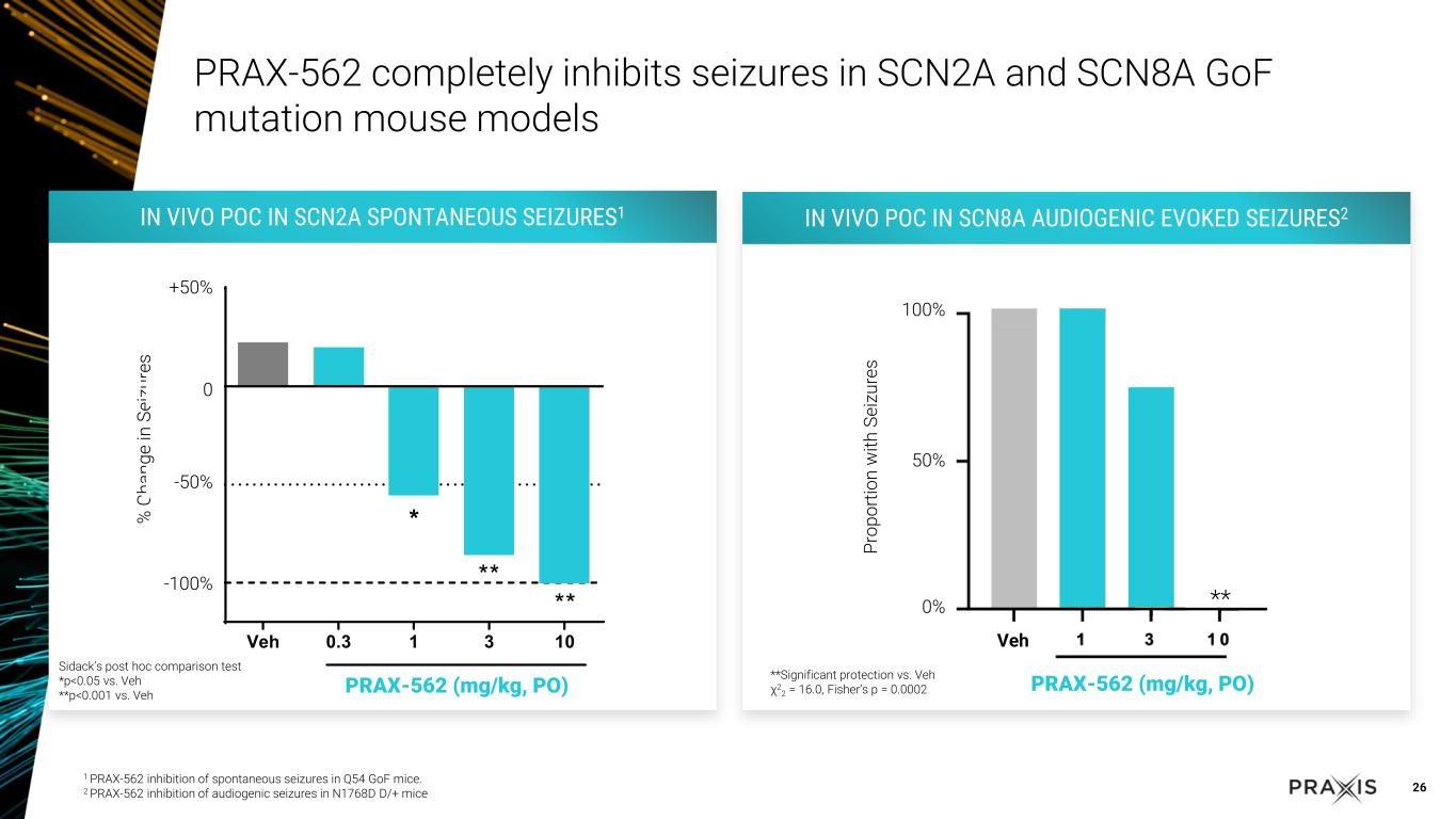 25 MES EFFICACY sLMA TOLERABILITY Our mechanistic hypothesis translates to a wide therapeutic index in vivo for PRAX-562 Therapeutic Index (TI) = TC50 / EC50 CD-1 mice; (n=12/group) **p<0.01 vs. Veh ED50: 2 mg/kg Molecule Plasma Therapeutic Index PRAX-562 17.2x PRAX-562 (mg/kg, PO) PRAX-562 (mg/kg, PO) CD-1 mice; (n=20/group) ANOVA/Dunnett **p<0.01 vs. Veh TD50: 44 mg/kg Veh 0.3 1 3 10 0 20 40 60 M ES La te nc y (s ec ) ** ** Veh 10 20 40 0 10000 20000 30000 40000 50000 60000 70000 To ta l D Is ta nc e Tr av el le d (m m ) ** **
