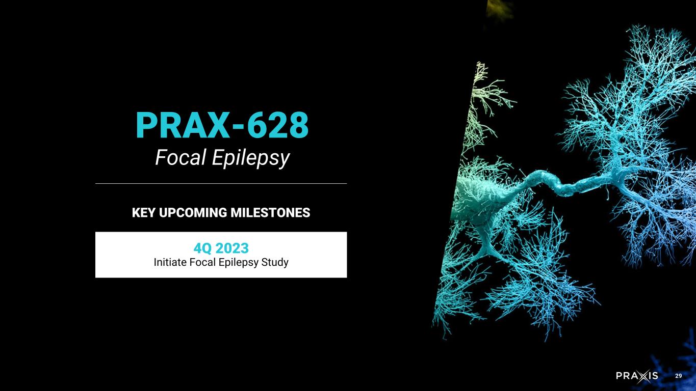 28 PRIMARY ENDPOINT: Incidence and severity of treatment- emergent adverse events (TEAEs) KEY SECONDARY: Change from baseline in monthly (28 day) motor seizure frequency PRAX-562 Phase 2 EMBOLD Study topline data expected 4Q23 * Two distinct cohorts in early-onset SCN2A-DEE and SCN8A-DEE patients + Participants receive either 0.5 mg/kg/day PRAX-562 QD for 16 weeks or 0.5 mg/kg/day PRAX-562 QD for 12 weeks & matching placebo QD for 4 weeks. Participants in the PRAX-562/placebo arm will receive placebo for 4 consecutive weeks during the 16-week treatment period, with timing of placebo administration blinded for both participants and investigator. Dose adjustment is permitted to a max of 1.0 mg/kg/day and a min of 0.25 mg/kg/day. Safety Follow- Up SAFETY FOLLOW- UP PERIOD (4 WEEKS) DOUBLE-BLIND TREATMENT PERIOD (16 WEEKS) PRAX-562 1:1 Randomization N=~20 (~10 SCN2A/~10 SCN8A)* OLE TREATMENT PERIOD (48 WEEKS) PRAX-562 0.5 mg/kg/day Placebo for 4 weeks/PRAX-562 for 12 weeks+ 0.5 mg/kg/day