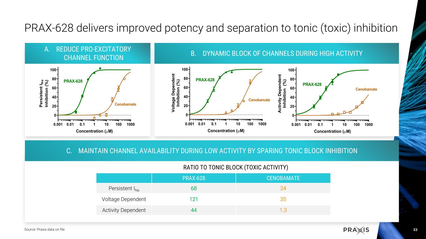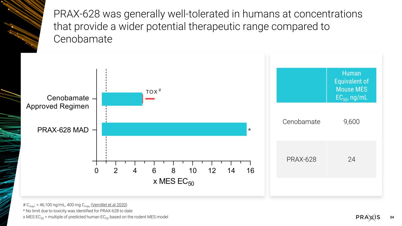 33 C. MAINTAIN CHANNEL AVAILABILITY DURING LOW ACTIVITY BY SPARING TONIC BLOCK INHIBITION PRAX-628 delivers improved potency and separation to tonic (toxic) inhibition 0.001 0.01 0.1 1 10 100 1000 0 20 40 60 80 100 Concentration (µM) P er si st en t I N a In hi bi tio n (% ) hNaV1.6 Persistent INa Cenobamate PRAX-628 0.001 0.01 0.1 1 10 100 1000 0 20 40 60 80 100 Concentration (µM) Vo lta ge D ep en de nt In hi bi tio n (% ) VDB hNaV1.6 Peak INa PRAX-628 Cenobamate 0.001 0.01 0.1 1 10 100 1000 0 20 40 60 80 100 Concentration (µM) A ct iv ity D ep en de nt In hi bi tio n (% ) UDB-10Hz hNaV1.6 Peak INa Cenobamate PRAX-628 PRAX-628 CENOBAMATE Persistent INa 68 24 Voltage Dependent 121 35 Activity Dependent 44 1.3 RATIO TO TONIC BLOCK (TOXIC ACTIVITY) A. REDUCE PRO-EXCITATORY CHANNEL FUNCTION B. DYNAMIC BLOCK OF CHANNELS DURING HIGH ACTIVITY Source: Praxis data on file
