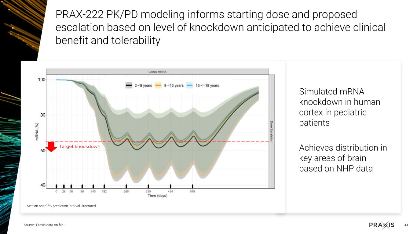 41 Simulated mRNA knockdown in human cortex in pediatric patients Achieves distribution in key areas of brain based on NHP data PRAX-222 PK/PD modeling informs starting dose and proposed escalation based on level of knockdown anticipated to achieve clinical benefit and tolerability Source: Praxis data on file. Median and 95% prediction interval illustrated Target knockdown 100 80 60 40