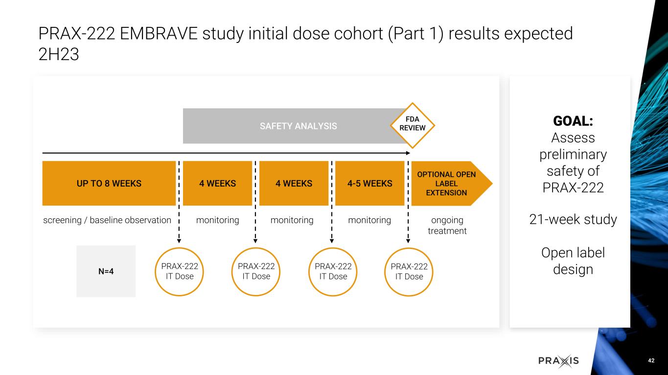 42 PRAX-222 EMBRAVE study initial dose cohort (Part 1) results expected 2H23 GOAL: Assess preliminary safety of PRAX-222 21-week study Open label design screening / baseline observation UP TO 8 WEEKS 4 WEEKS 4 WEEKS 4-5 WEEKS monitoring monitoring PRAX-222 IT Dose PRAX-222 IT Dose PRAX-222 IT Dose PRAX-222 IT Dose monitoring ongoing treatment OPTIONAL OPEN LABEL EXTENSION SAFETY ANALYSIS FDA REVIEW N=4