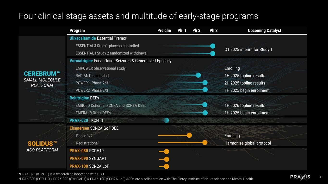 5 CEREBRUM SMALL MOLECULE PLATFORM Cerebrum utilizes deep understanding of neuronal excitability and neuronal networks and applies a series of computational and experimental tools to develop orally available precision therapies SOLIDUS ANTISENSE OLIGONUCLEOTIDE (ASO) PLATFORM Solidus is an efficient, targeted precision medicine discovery and development engine for ASOs anchored on proprietary, computational methodology Two platforms to generate optimized therapies for defined patient populations Molecule Indication Mechanism ulixacaltamide Essential Tremor T-type calcium channel modulator vormatrigine Focal Onset Seizures & Generalized Epilepsy Sodium channel functional state modulator for broad use relutrigine* DEE Epilepsies Sodium channel functional state modulator for pediatric use PRAX-020^ KCNT1 Epilepsy KCNT1 specific inhibitor PRAX-050 Not disclosed Not disclosed Molecule Indication Mechanism elsunersen** SCN2A GoF Gapmer ASO PRAX-080+ PCDH19 Mosaic expression Gapmer ASO PRAX-090+ SYNGAP1 LoF Splice switching ASO PRAX-100+ SCN2A LoF Splice switching ASO ^PRAX-020 (KCNT1) is a research collaboration with UCB +PRAX-080 (PCDH19 ), PRAX-090 (SYNGAP1) & PRAX-100 (SCN2A-LoF) ASOs are a collaboration with The Florey Institute of Neuroscience and Mental Health * Relutrigine has received ODD and RPD from the FDA, and ODD from the European Medicines Agency for the treatment of SCN2A-DEE and SCN8A-DEE ** Elsunersen has received ODD and RPD from the FDA, and ODD and PRIME designations from the European Medicines Agency (EMA) for the treatment of SCN2A-DEE