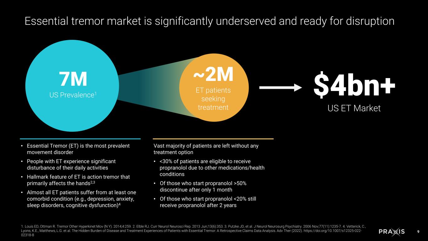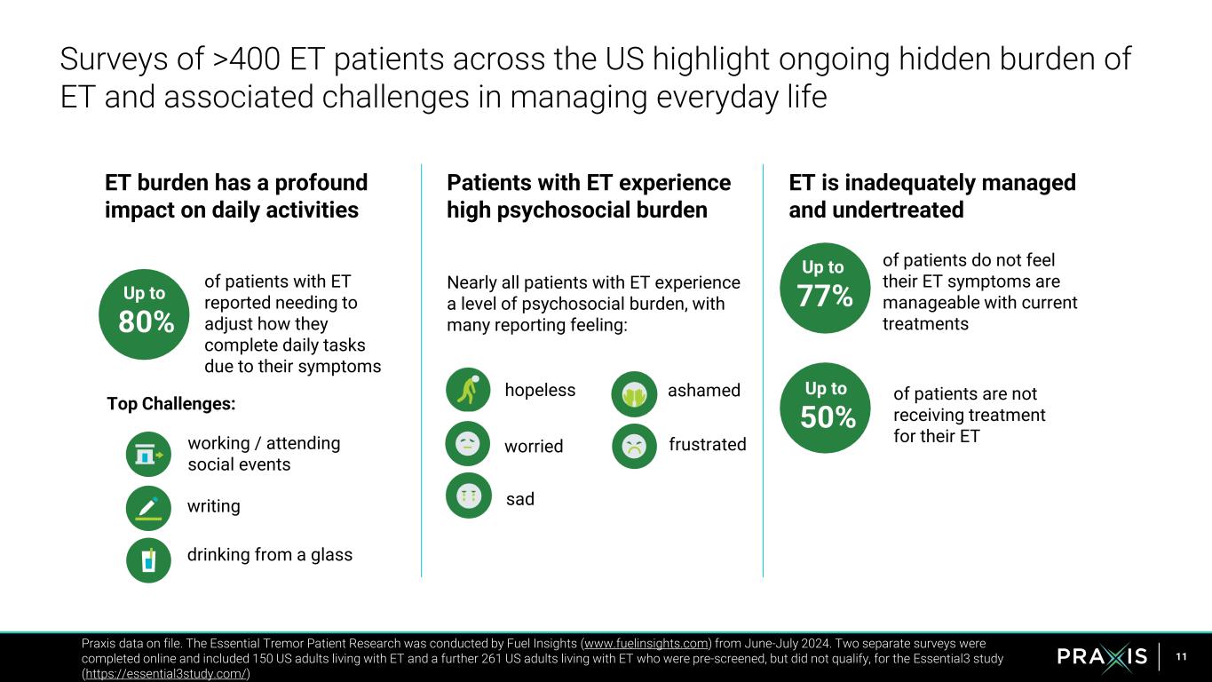 12 US neurologists emphasize the need for more effective treatments and the importance of patient-physician dialogue in ET Praxis data on file. The Essential Tremor HCP Research was conducted by Fuel Insights (www.fuelinsights.com) in April 2024. The survey was fielded at the American Academy of Neurology meeting and included 152 neurologists who treat ET in the US, and who were primarily affiliated with academic centers. ET burden has a profound impact on daily activities Patients with ET experience high psychosocial burden ET is inadequately managed and undertreated 60% of neurologists reported mental and emotional challenges among the top three challenges for their ET patients 40% >90% of patients seen by neurologists are not receiving treatment of neurologists stated their patients’ descriptions of their ET symptoms and impact on daily activities influence treatment decisions 85% of neurologist visits are for patients seeking ET treatment Nearly 1/2 of neurologists rarely refer ET patients for specialist management