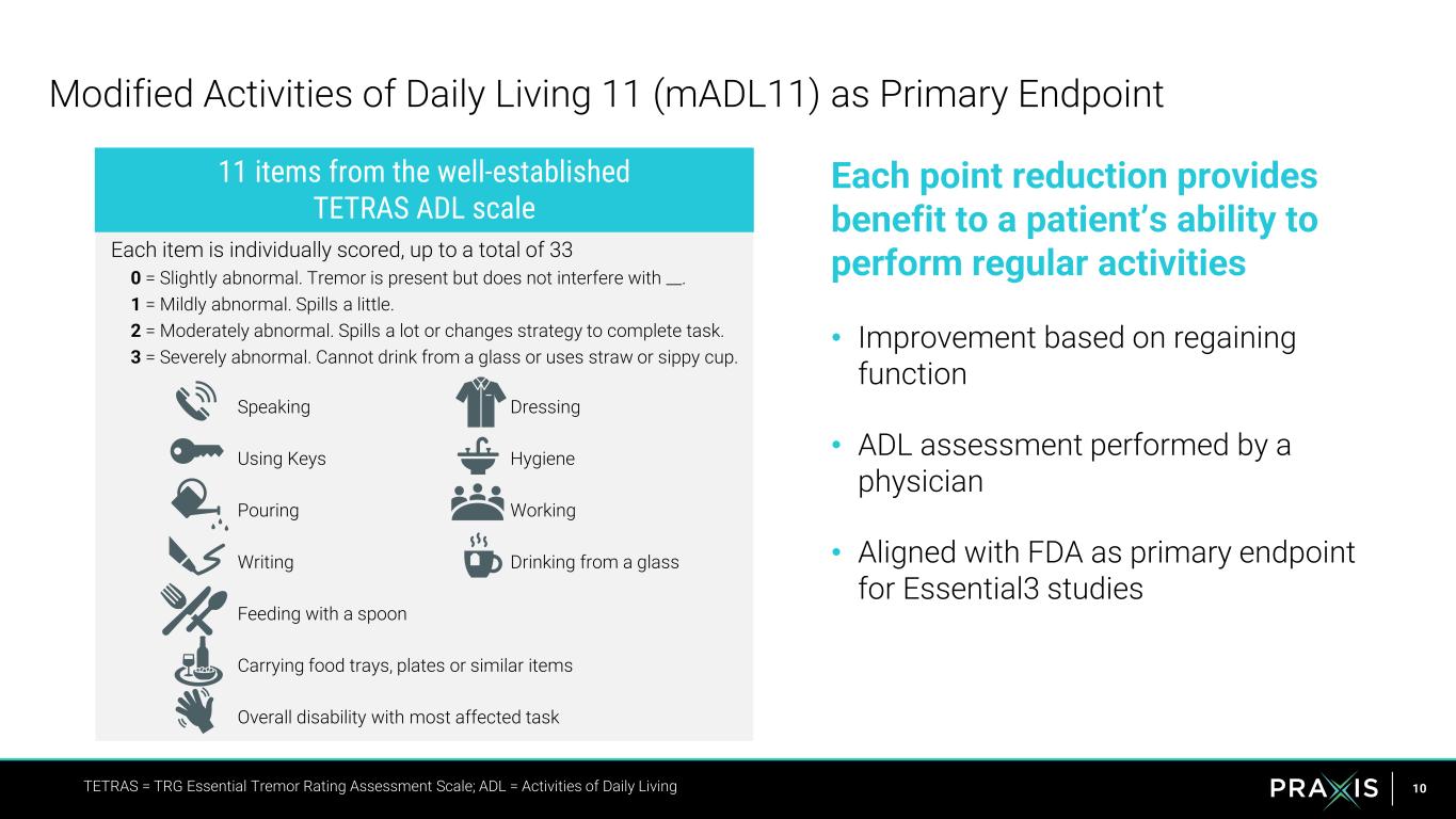 9 Essential tremor market is significantly underserved and ready for disruption $4bn+ US ET Market 1. Louis ED, Ottman R. Tremor Other Hyperkinet Mov (N Y). 2014;4:259. 2. Elble RJ. Curr Neurol Neurosci Rep. 2013 Jun;13(6):353. 3. Putzke JD, et al. J Neurol Neurosurg Psychiatry. 2006 Nov;77(11):1235-7. 4. Vetterick, C., Lyons, K.E., Matthews, L.G. et al. The Hidden Burden of Disease and Treatment Experiences of Patients with Essential Tremor: A Retrospective Claims Data Analysis. Adv Ther (2022). https://doi.org/10.1007/s12325-022- 02318-8 • Essential Tremor (ET) is the most prevalent movement disorder • People with ET experience significant disturbance of their daily activities • Hallmark feature of ET is action tremor that primarily affects the hands2,3 • Almost all ET patients suffer from at least one comorbid condition (e.g., depression, anxiety, sleep disorders, cognitive dysfunction)4 Vast majority of patients are left without any treatment option • <30% of patients are eligible to receive propranolol due to other medications/health conditions • Of those who start propranolol >50% discontinue after only 1 month • Of those who start propranolol <20% still receive propranolol after 2 years ~2M ET patients seeking treatment 7M US Prevalence1