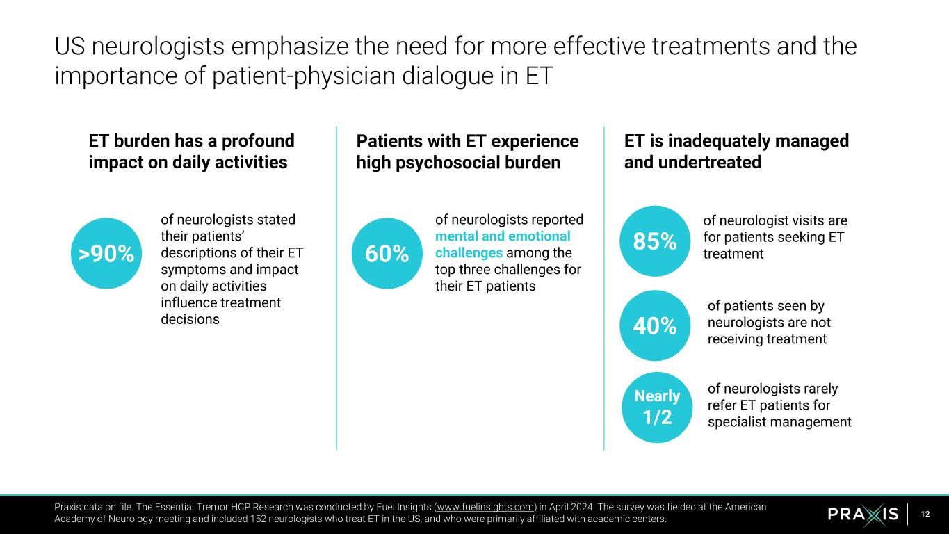 11 Surveys of >400 ET patients across the US highlight ongoing hidden burden of ET and associated challenges in managing everyday life Praxis data on file. The Essential Tremor Patient Research was conducted by Fuel Insights (www.fuelinsights.com) from June-July 2024. Two separate surveys were completed online and included 150 US adults living with ET and a further 261 US adults living with ET who were pre-screened, but did not qualify, for the Essential3 study (https://essential3study.com/) ET burden has a profound impact on daily activities Patients with ET experience high psychosocial burden Nearly all patients with ET experience a level of psychosocial burden, with many reporting feeling: ET is inadequately managed and undertreated Up to 80% working / attending social events writing drinking from a glass frustratedworried Up to 77% Up to 50% of patients do not feel their ET symptoms are manageable with current treatments of patients are not receiving treatment for their ET of patients with ET reported needing to adjust how they complete daily tasks due to their symptoms Top Challenges: ashamed sad hopeless