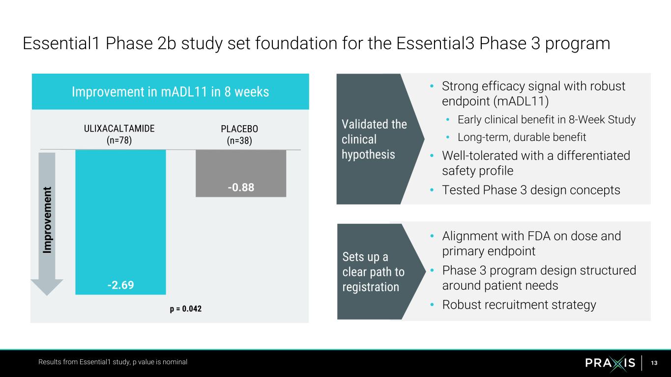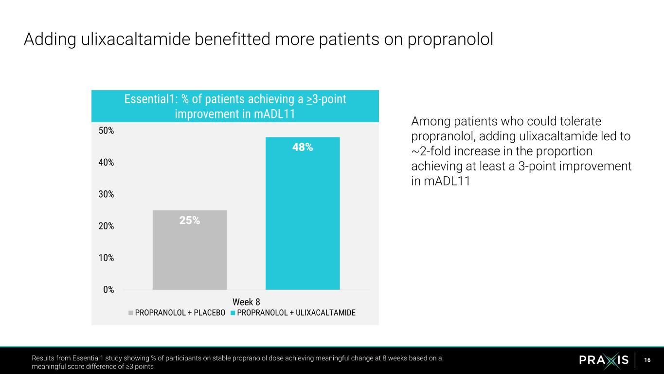 15 31% 55% 64% 0% 10% 20% 30% 40% 50% 60% 70% PLACEBO ULIXACALTAMIDE ULIXACALTAMIDE MAINTAINED Majority of patients achieved at least a 3-point change in mADL11 at 8 weeks Durable response in extension study patients who continued through 14 weeks Results from Essential1 study measuring participants achieving meaningful change at 8 and 14 weeks based on ≥3-point improvement from baseline https://praxismedicines.com/wp-content/uploads/2023/09/Giroux_MDS2023_E1_MSD_SUBMIT.pdf Essential1 Study – 8 weeks Essential1: % participants achieving > 3-point improvement in mADL11 Essential1 Extension–14 weeks p = 0.023