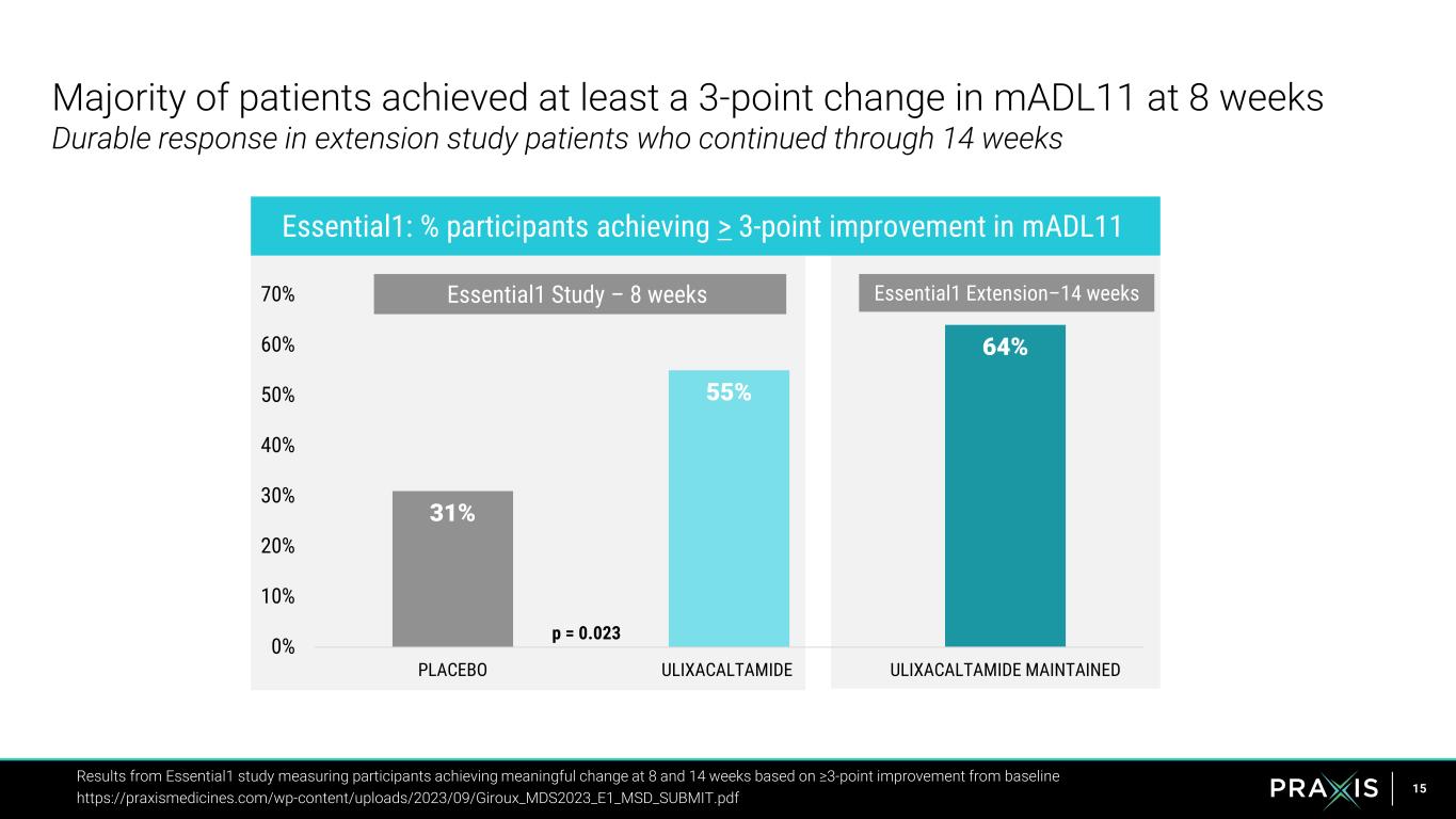14 Using Essential1 to define clinical meaningfulness in essential tremor MSD=Meaningful Score Difference, PGI-C = Patient Global Impression of Change 8 6 4 2 0 -2 -4 -6 -8 -10 -12 -14 -16 -18 -20 • Patient response on mADL11 endpoint was well-correlated to PGI-C response • Aligned with recently issued guidance from Clinical Outcomes Assessment for novel endpoints ESSENTIAL1 ANCHOR-BASED ASSESSMENT PGI-C:mADL11