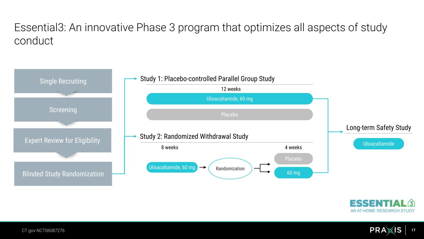 16 25% 48% 0% 10% 20% 30% 40% 50% Week 8 PROPRANOLOL + PLACEBO PROPRANOLOL + ULIXACALTAMIDE Adding ulixacaltamide benefitted more patients on propranolol Results from Essential1 study showing % of participants on stable propranolol dose achieving meaningful change at 8 weeks based on a meaningful score difference of ≥3 points Essential1: % of patients achieving a >3-point improvement in mADL11 Among patients who could tolerate propranolol, adding ulixacaltamide led to ~2-fold increase in the proportion achieving at least a 3-point improvement in mADL11