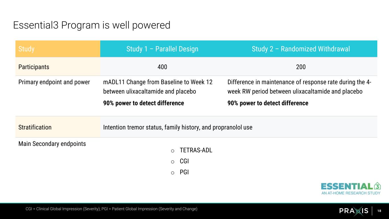 17 Essential3: An innovative Phase 3 program that optimizes all aspects of study conduct Single Recruiting Expert Review for Eligibility Screening Blinded Study Randomization Study 1: Placebo-controlled Parallel Group Study Ulixacaltamide, 60 mg Placebo Study 2: Randomized Withdrawal Study Ulixacaltamide, 60 mg Randomization 60 mg Placebo Long-term Safety Study Ulixacaltamide CT.gov NCT06087276 8 weeks 4 weeks 12 weeks