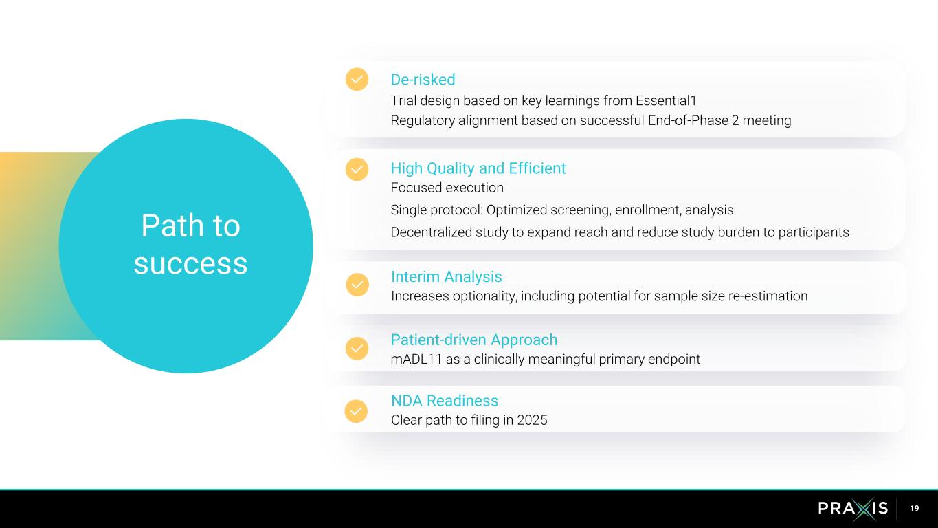 18 Essential3 Program is well powered Study Study 1 – Parallel Design Study 2 – Randomized Withdrawal Participants 400 200 Primary endpoint and power mADL11 Change from Baseline to Week 12 between ulixacaltamide and placebo 90% power to detect difference Difference in maintenance of response rate during the 4- week RW period between ulixacaltamide and placebo 90% power to detect difference Stratification Intention tremor status, family history, and propranolol use Main Secondary endpoints o TETRAS-ADL o CGI o PGI CGI = Clinical Global Impression (Severity); PGI = Patient Global Impression (Severity and Change)