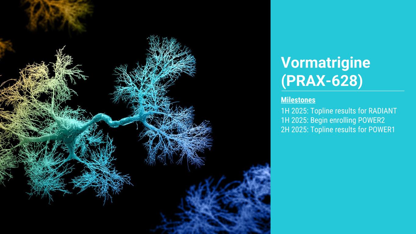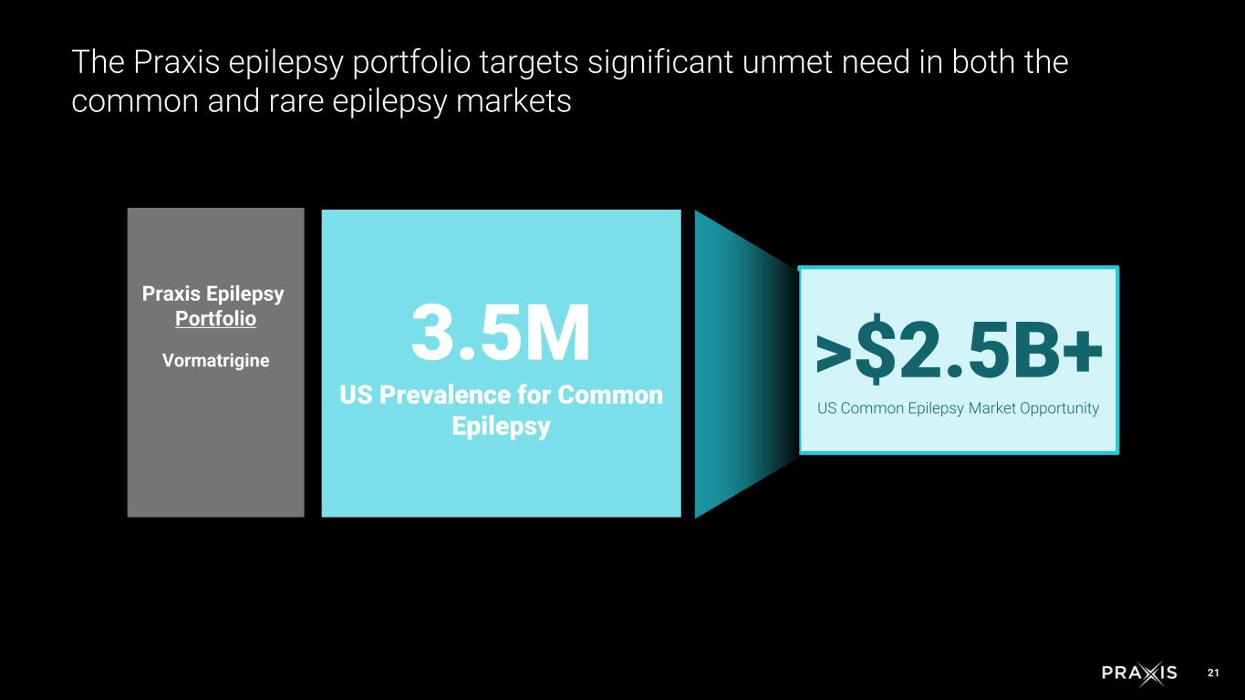 20 Vormatrigine (PRAX-628) Milestones 1H 2025: Topline results for RADIANT 1H 2025: Begin enrolling POWER2 2H 2025: Topline results for POWER1