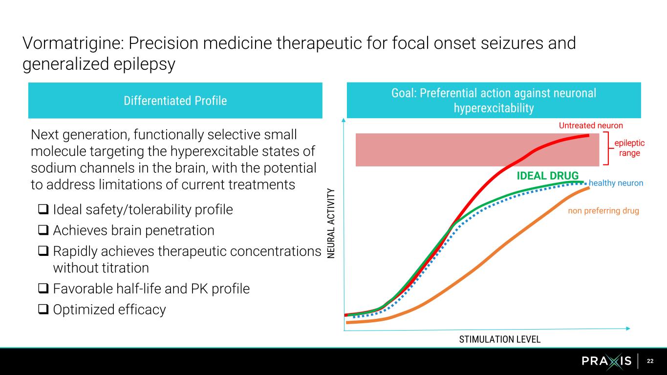 21 The Praxis epilepsy portfolio targets significant unmet need in both the common and rare epilepsy markets >$2.5B+ US Common Epilepsy Market Opportunity 3.5M US Prevalence for Common Epilepsy Praxis Epilepsy Portfolio Vormatrigine
