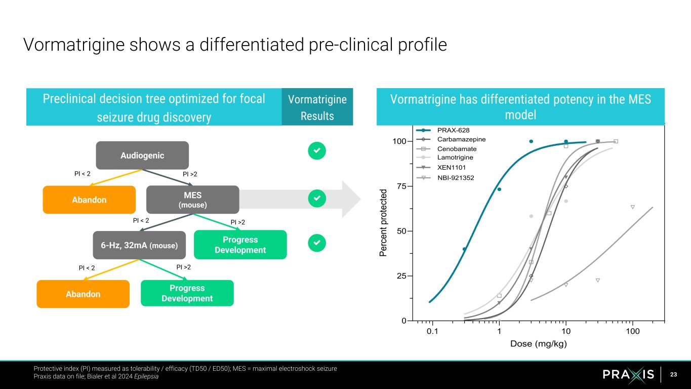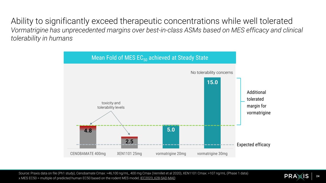 23 0.1 1 10 100 0 25 50 75 100 Dose (mg/kg) Pe rc en t p ro te ct ed PRAX-628 Cenobamate Lamotrigine XEN1101 Carbamazepine NBI-921352 Vormatrigine shows a differentiated pre-clinical profile Protective index (PI) measured as tolerability / efficacy (TD50 / ED50); MES = maximal electroshock seizure Praxis data on file; Bialer et al 2024 Epilepsia Vormatrigine has differentiated potency in the MES model Preclinical decision tree optimized for focal seizure drug discovery Progress Development Abandon Progress DevelopmentAbandon PI >2 PI >2 PI >2 PI < 2 PI < 2 PI < 2 Audiogenic MES (mouse) 6-Hz, 32mA (mouse) Vormatrigine Results