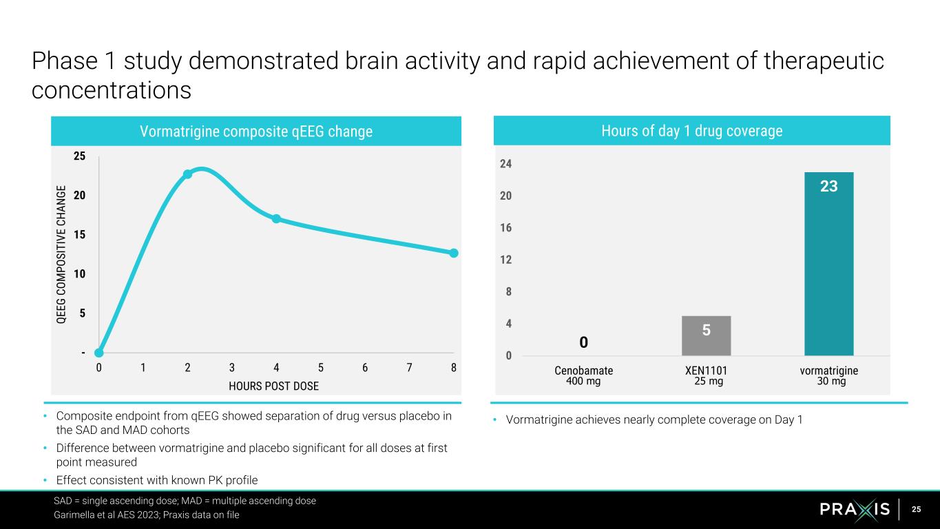 24 Source: Praxis data on file (Ph1 study), Cenobamate Cmax: >46,100 ng/mL, 400 mg Cmax (Vernillet et al 2020), XEN1101 Cmax: >107 ng/mL (Phase 1 data) x MES EC50 = multiple of predicted human EC50 based on the rodent MES model; IEC2023_628-SAD-MAD 4.8 2.5 5.0 15.0 CENOBAMATE 400mg XEN1101 25mg vormatrigine 20mg vormatrigine 30mg Mean Fold of MES EC50 achieved at Steady State Expected efficacy Additional tolerated margin for vormatrigine toxicity and tolerability levels No tolerability concerns Ability to significantly exceed therapeutic concentrations while well tolerated Vormatrigine has unprecedented margins over best-in-class ASMs based on MES efficacy and clinical tolerability in humans