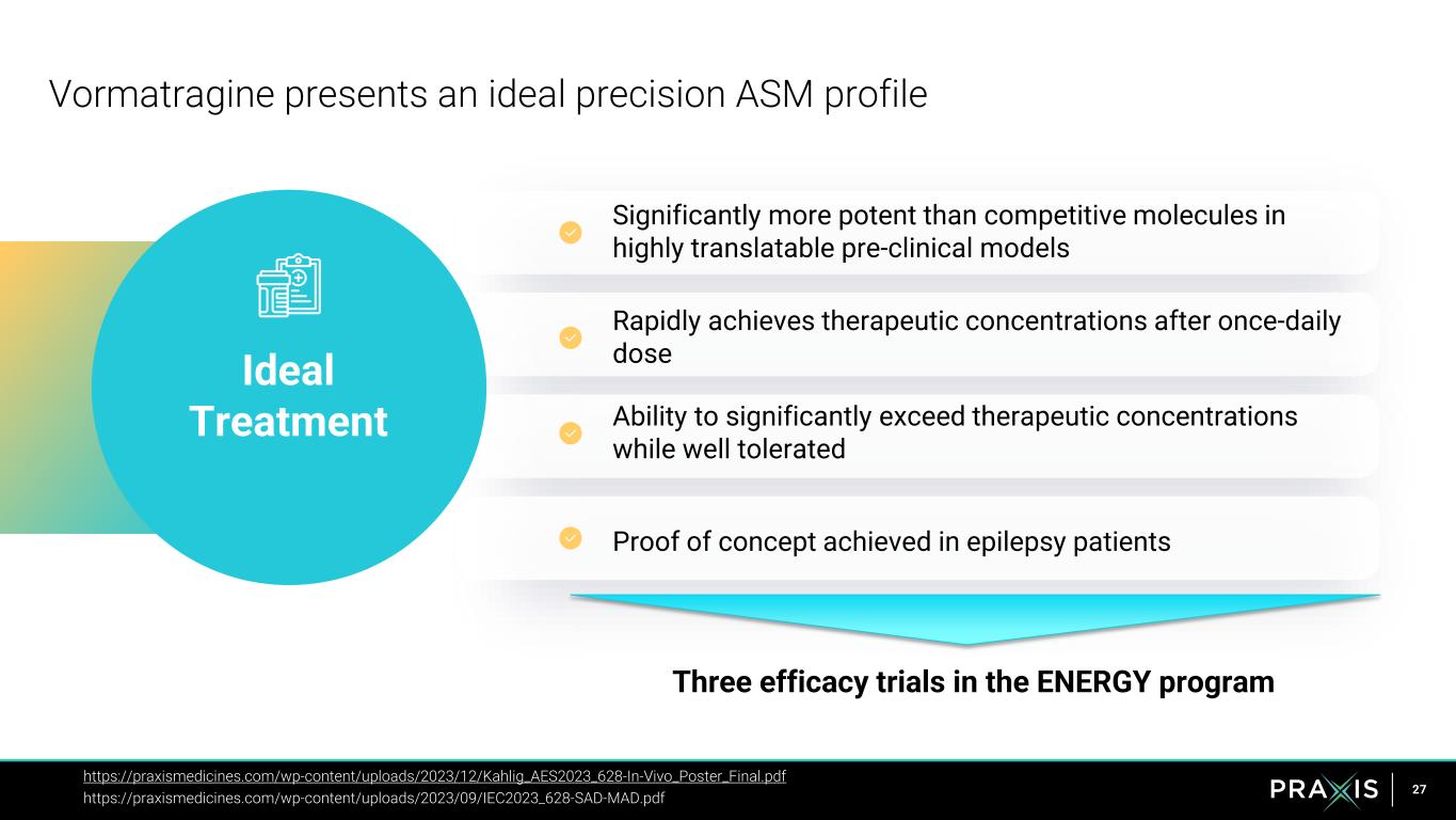 26 • Patients must demonstrate PPR response during screening and baseline to be evaluable • Response Assessment • Partial: Reduction, other than to zero, in the number of generalized PPR events at any assessment period vs baseline • Complete: Reduction to zero in the number of generalized PPR events at any assessment period vs baseline • Safety monitored and PK samples collected during observation period The Phase 2 vormatrigine Photo Paroxysmal Response (PPR) study demonstrated proof of concept; de-risks advancing to studies in focal and generalized epilepsy https://investors.praxismedicines.com/static-files/edc15000-7fcb-4d6d-b1de-1819898214a8 15 mg 45 mg Part A Part B Assessment Screening Baseline 24h Dose Categorical Response Response Rate 15 mg None 0% (0/5) Partial 20% (1/5) Complete 80% (4/5) 45 mg None 0% (0/3) Complete 100% (3/3) Evaluable Response 100% (8/8) Study Results • 100% response in treated patients • Vormatrigine achieved between 3-13x multiples of MES EC50 exposure • Safety was consistent with prior dose escalation study and AEs were mild