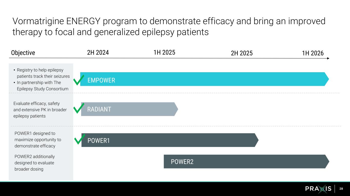 27 Vormatragine presents an ideal precision ASM profile https://praxismedicines.com/wp-content/uploads/2023/12/Kahlig_AES2023_628-In-Vivo_Poster_Final.pdf https://praxismedicines.com/wp-content/uploads/2023/09/IEC2023_628-SAD-MAD.pdf Ability to significantly exceed therapeutic concentrations while well tolerated Rapidly achieves therapeutic concentrations after once-daily dose Significantly more potent than competitive molecules in highly translatable pre-clinical models Ideal Treatment Proof of concept achieved in epilepsy patients Three efficacy trials in the ENERGY program