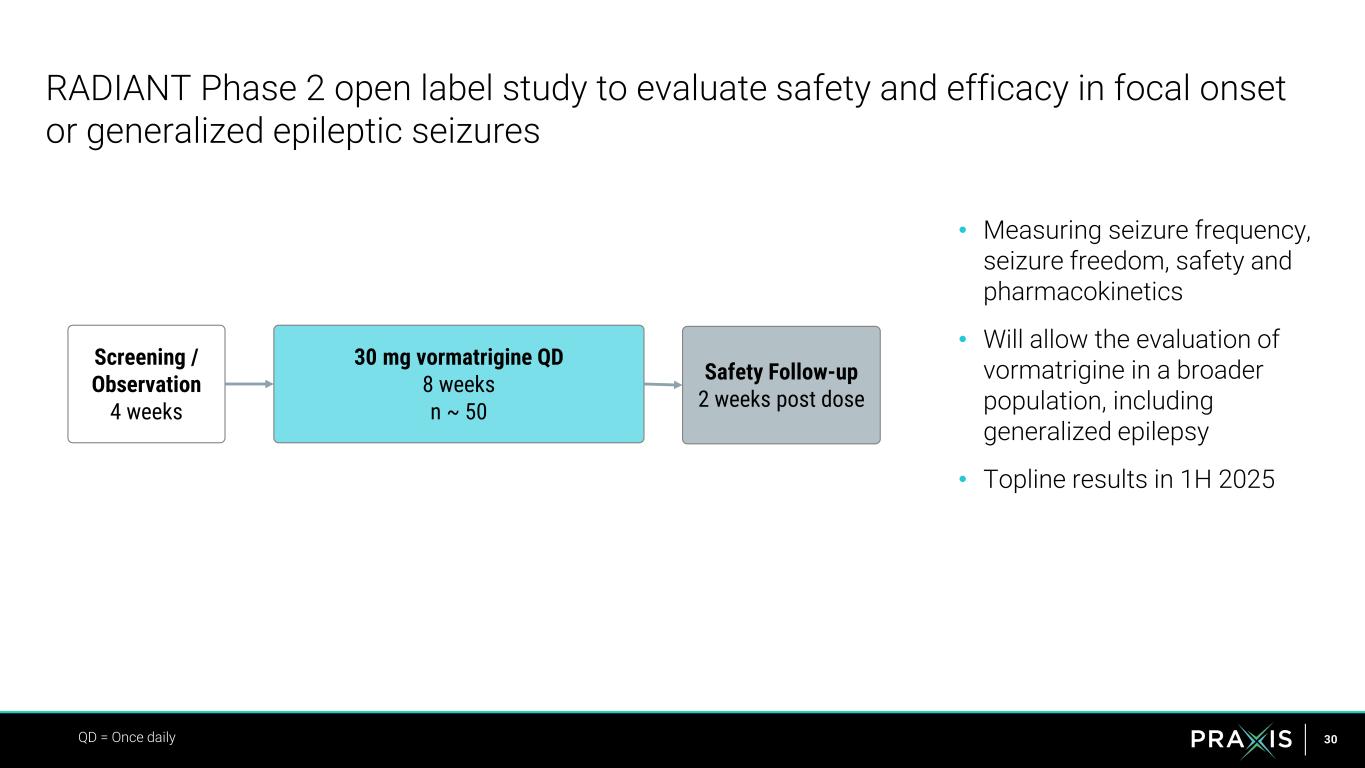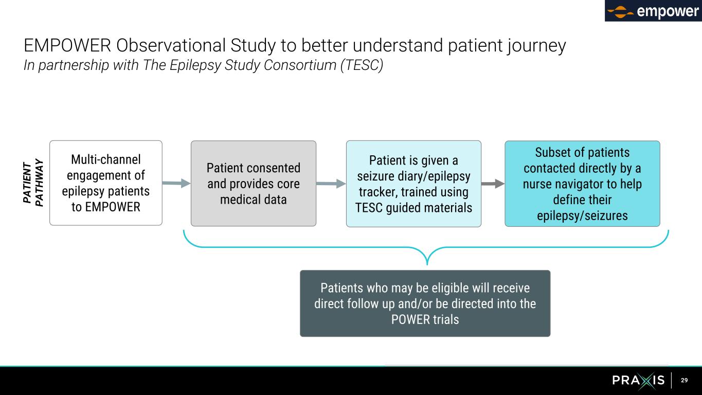 28 Vormatrigine ENERGY program to demonstrate efficacy and bring an improved therapy to focal and generalized epilepsy patients • Registry to help epilepsy patients track their seizures • In partnership with The Epilepsy Study Consortium POWER1 designed to maximize opportunity to demonstrate efficacy POWER2 additionally designed to evaluate broader dosing Evaluate efficacy, safety and extensive PK in broader epilepsy patients EMPOWER POWER1 POWER2 RADIANT 2H 2024 1H 20261H 2025 2H 2025Objective