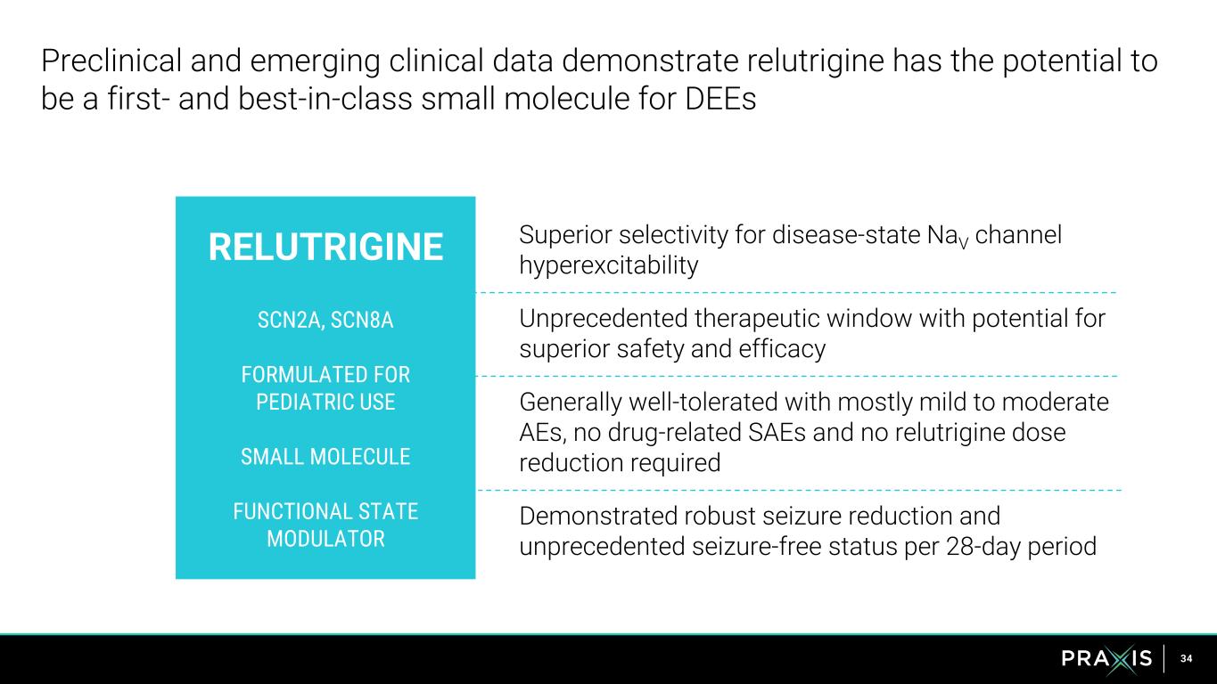 33 >$500M US Market Opportunity * Poke G, Stanley J, Scheffer IE, Sadleir LG. Epidemiology of Developmental and Epileptic Encephalopathy and of Intellectual Disability and Epilepsy in Children >100k Developmental Epilepsies with high seizure burden using sodium channel blockers* >$2B+ Opportunity for DEEs ~5K SCN2/8A US patients Relutrigine Addressable Patients Peak Revenue Potential Relutrigine is poised to disrupt the DEE market