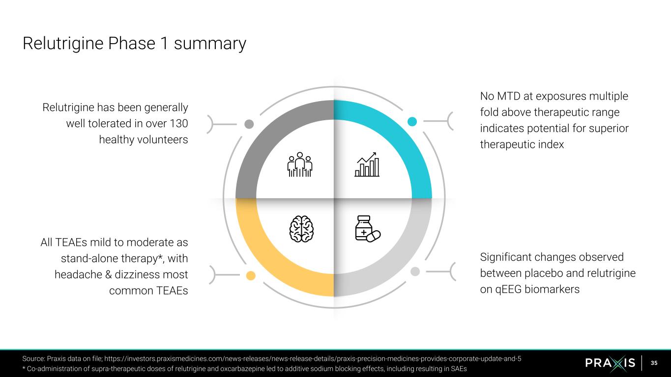 34 Superior selectivity for disease-state NaV channel hyperexcitability Unprecedented therapeutic window with potential for superior safety and efficacy Generally well-tolerated with mostly mild to moderate AEs, no drug-related SAEs and no relutrigine dose reduction required Demonstrated robust seizure reduction and unprecedented seizure-free status per 28-day period Preclinical and emerging clinical data demonstrate relutrigine has the potential to be a first- and best-in-class small molecule for DEEs RELUTRIGINE SCN2A, SCN8A FORMULATED FOR PEDIATRIC USE SMALL MOLECULE FUNCTIONAL STATE MODULATOR