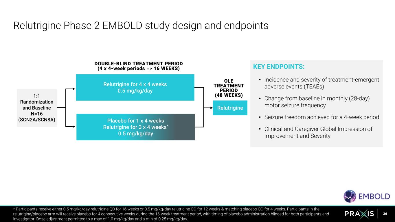 35 Relutrigine Phase 1 summary Source: Praxis data on file; https://investors.praxismedicines.com/news-releases/news-release-details/praxis-precision-medicines-provides-corporate-update-and-5 * Co-administration of supra-therapeutic doses of relutrigine and oxcarbazepine led to additive sodium blocking effects, including resulting in SAEs All TEAEs mild to moderate as stand-alone therapy*, with headache & dizziness most common TEAEs Significant changes observed between placebo and relutrigine on qEEG biomarkers Relutrigine has been generally well tolerated in over 130 healthy volunteers No MTD at exposures multiple fold above therapeutic range indicates potential for superior therapeutic index