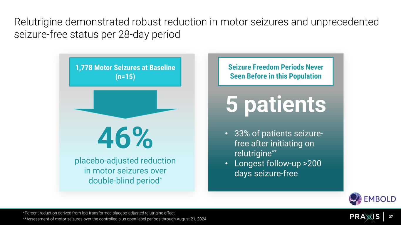 36 KEY ENDPOINTS: • Incidence and severity of treatment-emergent adverse events (TEAEs) • Change from baseline in monthly (28-day) motor seizure frequency • Seizure freedom achieved for a 4-week period • Clinical and Caregiver Global Impression of Improvement and Severity Relutrigine Phase 2 EMBOLD study design and endpoints * Participants receive either 0.5 mg/kg/day relutrigine QD for 16 weeks or 0.5 mg/kg/day relutrigine QD for 12 weeks & matching placebo QD for 4 weeks. Participants in the relutrigine/placebo arm will receive placebo for 4 consecutive weeks during the 16-week treatment period, with timing of placebo administration blinded for both participants and investigator. Dose adjustment permitted to a max of 1.0 mg/kg/day and a min of 0.25 mg/kg/day. DOUBLE-BLIND TREATMENT PERIOD (4 x 4-week periods => 16 WEEKS) Relutrigine 1:1 Randomization and Baseline N=16 (SCN2A/SCN8A) OLE TREATMENT PERIOD (48 WEEKS) Relutrigine for 4 x 4 weeks 0.5 mg/kg/day Placebo for 1 x 4 weeks Relutrigine for 3 x 4 weeks* 0.5 mg/kg/day