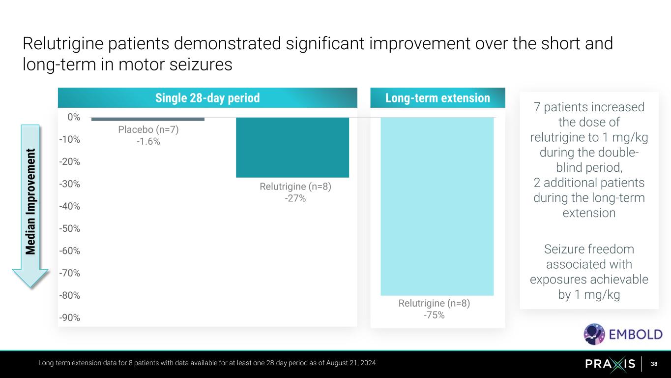 37 Relutrigine demonstrated robust reduction in motor seizures and unprecedented seizure-free status per 28-day period *Percent reduction derived from log-transformed placebo-adjusted relutrigine effect **Assessment of motor seizures over the controlled plus open-label periods through August 21, 2024 • 33% of patients seizure- free after initiating on relutrigine** • Longest follow-up >200 days seizure-free 5 patients 1,778 Motor Seizures at Baseline (n=15) 46% placebo-adjusted reduction in motor seizures over double-blind period* Seizure Freedom Periods Never Seen Before in this Population