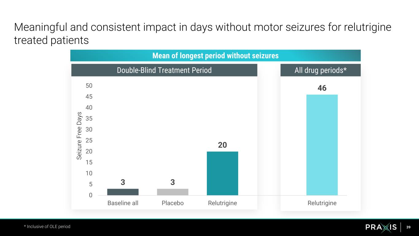 38 -90% -80% -70% -60% -50% -40% -30% -20% -10% 0% Relutrigine patients demonstrated significant improvement over the short and long-term in motor seizures Long-term extension data for 8 patients with data available for at least one 28-day period as of August 21, 2024 Placebo (n=7) -1.6% Relutrigine (n=8) -27% Relutrigine (n=8) -75% 7 patients increased the dose of relutrigine to 1 mg/kg during the double- blind period, 2 additional patients during the long-term extension Seizure freedom associated with exposures achievable by 1 mg/kg Long-term extensionSingle 28-day period M ed ia n Im pr ov em en t