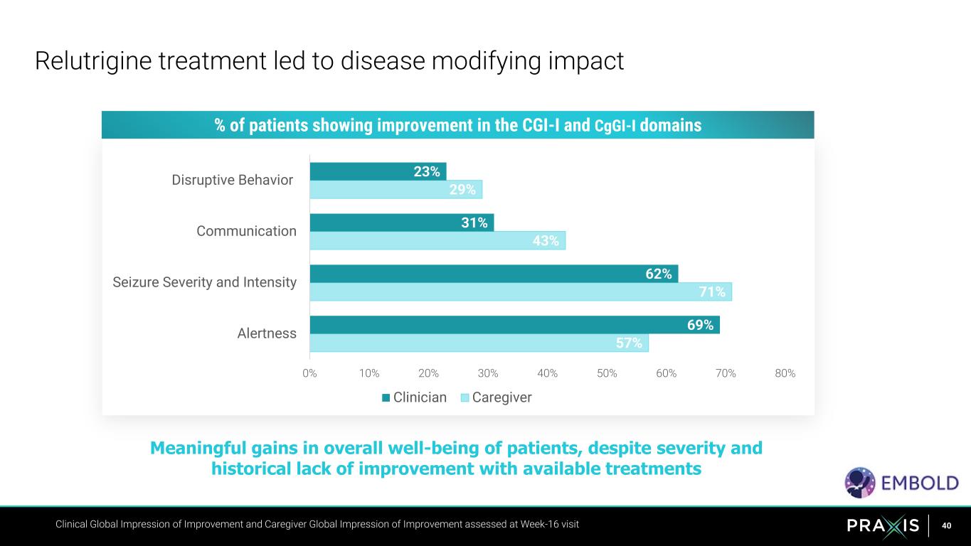 39 Meaningful and consistent impact in days without motor seizures for relutrigine treated patients * Inclusive of OLE period 3 3 20 46 0 5 10 15 20 25 30 35 40 45 50 Baseline all Placebo Relutrigine Relutrigine Double-Blind Treatment Period All drug periods* Mean of longest period without seizures Se iz ur e Fr ee D ay s