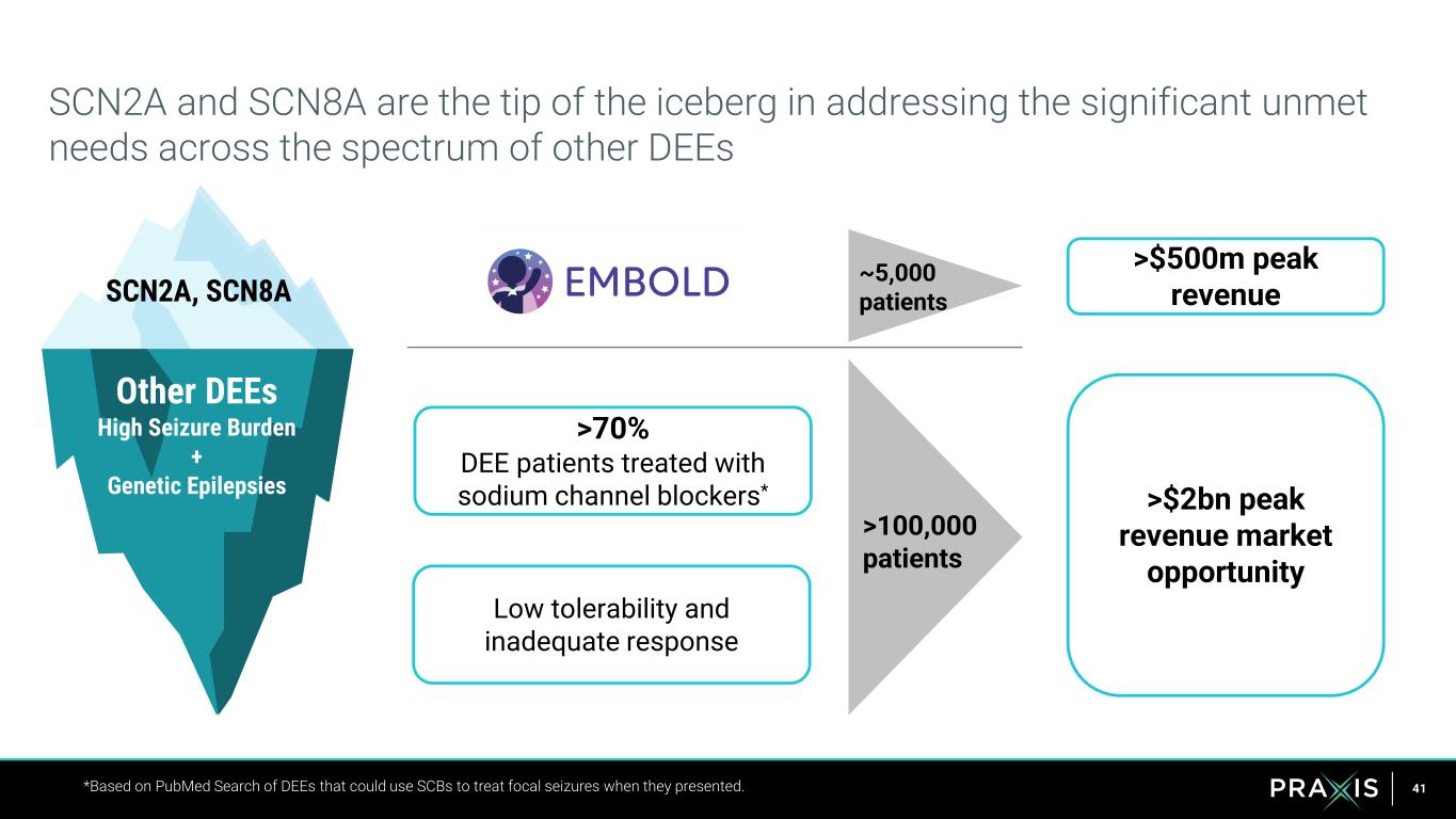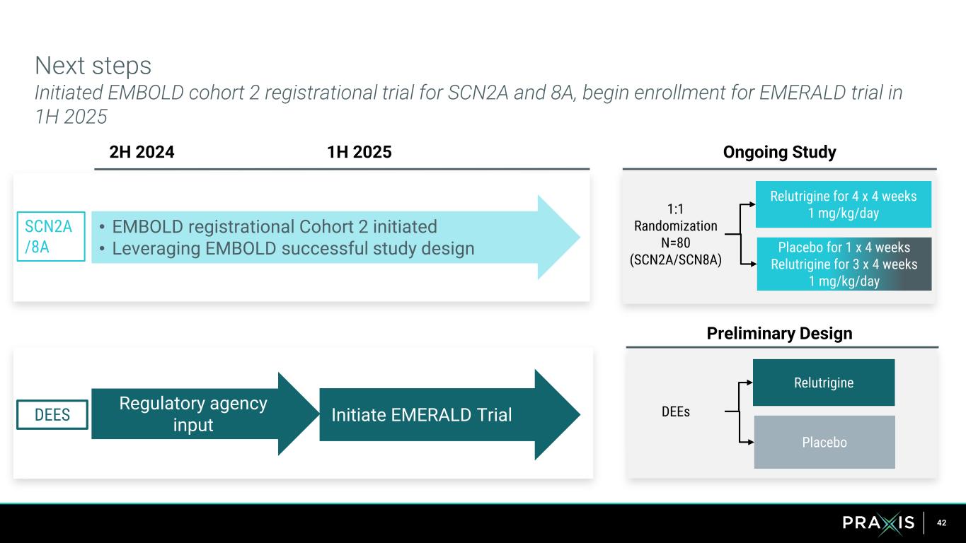 41 SCN2A and SCN8A are the tip of the iceberg in addressing the significant unmet needs across the spectrum of other DEEs *Based on PubMed Search of DEEs that could use SCBs to treat focal seizures when they presented. >$500m peak revenue Low tolerability and inadequate response >70% DEE patients treated with sodium channel blockers* SCN2A, SCN8A Other DEEs High Seizure Burden + Genetic Epilepsies >$2bn peak revenue market opportunity >100,000 patients ~5,000 patients