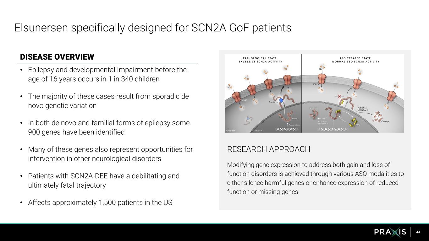 44 Elsunersen specifically designed for SCN2A GoF patients DISEASE OVERVIEW • Epilepsy and developmental impairment before the age of 16 years occurs in 1 in 340 children • The majority of these cases result from sporadic de novo genetic variation • In both de novo and familial forms of epilepsy some 900 genes have been identified • Many of these genes also represent opportunities for intervention in other neurological disorders • Patients with SCN2A-DEE have a debilitating and ultimately fatal trajectory • Affects approximately 1,500 patients in the US RESEARCH APPROACH Modifying gene expression to address both gain and loss of function disorders is achieved through various ASO modalities to either silence harmful genes or enhance expression of reduced function or missing genes