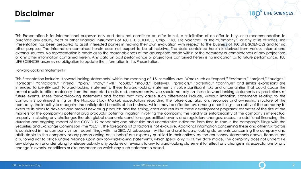 180 Life Sciences Corp. www.180lifesciences.com This Presentation is for informational purposes only and does not constitute an offer to sell, a solicitation of an offer to buy, or a recommendation to purchase any equity, debt or other financial instruments of 180 LIFE SCIENCES Corp . (“ 180 Life Sciences” or the “Company”) or any of its affiliates . This Presentation has been prepared to assist interested parties in making their own evaluation with respect to the business of 180 LIFE SCIENCES and for no other purpose . The information contained herein does not purport to be all - inclusive . The data contained herein is derived from various internal and external sources . No representation is made as to the reasonableness of the assumptions made within or the accuracy or completeness of any projections or any other information contained herein . Any data on past performance or projections contained herein is no indication as to future performance . 180 LIFE SCIENCES assumes no obligation to update the information in this Presentation . Forward - Looking Statements This Presentation includes “forward - looking statements” within the meaning of U . S . securities laws . Words such as “expect,” “estimate,” “project,” “budget,” “forecast,” “anticipate,” “intend,” “plan,” “may,” “will,” “could,” “should,” “believes,” “predicts,” “potential,” “continue” and similar expressions are intended to identify such forward - looking statements . These forward - looking statements involve significant risks and uncertainties that could cause the actual results to differ materially from the expected results and, consequently, you should not rely on these forward - looking statements as predictions of future events . These forward - looking statements and factors that may cause such differences include, without limitation, statements relating to the company’s continued listing on the Nasdaq Stock Market ; expectations regarding the future capitalization, resources and ownership structure of the company ; the inability to recognize the anticipated benefits of the business, which may be affected by, among other things, the ability of the company to execute its plans to develop and market new drug products and the timing, costs and results of these development programs ; estimates of the size of the markets for the company’s potential drug products ; potential litigation involving the company ; the validity or enforceability of the company’s intellectual property, including any challenges thereto ; global economic conditions ; geopolitical events and regulatory changes ; access to additional financing ; the duration and ongoing impact of the COVID - 19 pandemic ; and other risks and uncertainties indicated from time to time in the company’s filings with the Securities and Exchange Commission (the “SEC”) . The foregoing list of factors is not exclusive . Additional information concerning these and other risk factors is contained in the company’s most recent filings with the SEC . All subsequent written and oral forward - looking statements concerning the company and attributable to the company or any person acting on its behalf are expressly qualified in their entirety by the cautionary statements above . Readers are cautioned not to place undue reliance upon any forward - looking statements, which speak only as of the date made . The company does not undertake any obligation or undertaking to release publicly any updates or revisions to any forward - looking statement to reflect any change in its expectations or any change in events, conditions or circumstances on which any such statement is based . Disclaimer 2