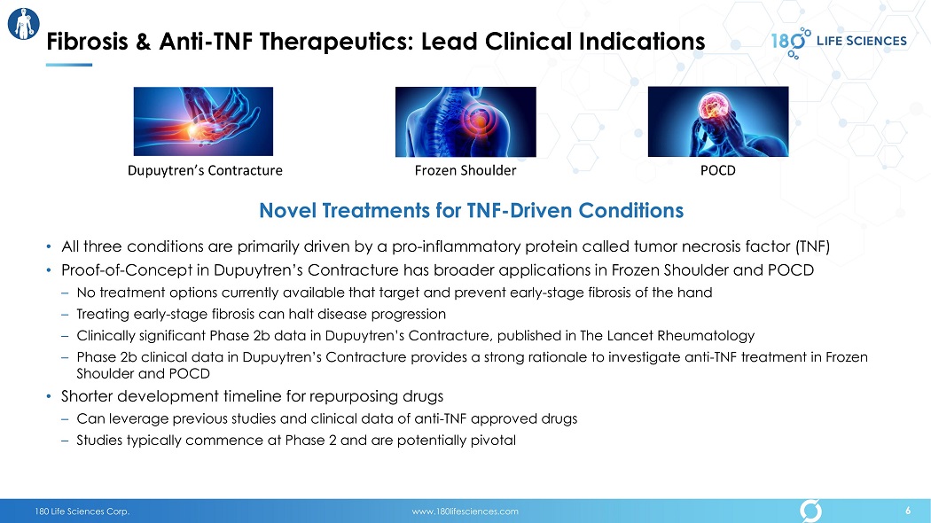 180 Life Sciences Corp. www.180lifesciences.com 5 Frank Knuettel II, MBA Independent Director Pamela Marrone, PhD Independent Director Prof. Larry Gold, PhD Independent Director Donald McGovern, Jr. Independent Director Russell Ray, MBA Independent Director Teresa DeLuca, MD, MBA Independent Director James Woody, MD, PhD Director, CEO Prof. Sir Marc Feldmann Executive Co - Chairman Co - Founder University of Oxford Prof. Lawrence Steinman Executive Co - Chairman Co - Founder Stanford University Jonathan Rothbard, PhD Chief Scientific Officer Prof. Jagdeep Nanchahal Co - Founder; Chair, Clinical Advisory Board University of Oxford Prof . Raphael Mechoulam Co - Founder Hebrew University Ozan Pamir Chief Financial Officer Management Team Board of Directors James Woody, MD, PhD Chief Executive Officer Prof. Sir Marc Feldmann Co - Chairman Prof. Lawrence Steinman Co - Chairman Experienced Leadership Team Founders