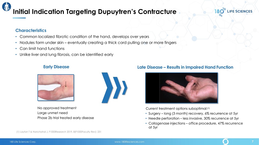 180 Life Sciences Corp. www.180lifesciences.com Fibrosis & Anti - TNF Therapeutics: Lead Clinical Indications Novel Treatments for TNF - Driven Conditions Dupuytren’s Contracture Frozen Shoulder POCD 6 • All three conditions are primarily driven by a pro - inflammatory protein called tumor necrosis factor (TNF) • Proof - of - Concept in Dupuytren’s Contracture has broader applications in Frozen Shoulder and POCD ⎯ No treatment options currently available that target and prevent early - stage fibrosis of the hand ⎯ Treating early - stage fibrosis can halt disease progression ⎯ Clinically significant Phase 2b data in Dupuytren’s Contracture, published in The Lancet Rheumatology ⎯ Phase 2b clinical data in Dupuytren’s Contracture provides a strong rationale to investigate anti - TNF treatment in Frozen Shoulder and POCD • Shorter development timeline for repurposing drugs ⎯ Can leverage previous studies and clinical data of anti - TNF approved drugs ⎯ Studies typically commence at Phase 2 and are potentially pivotal