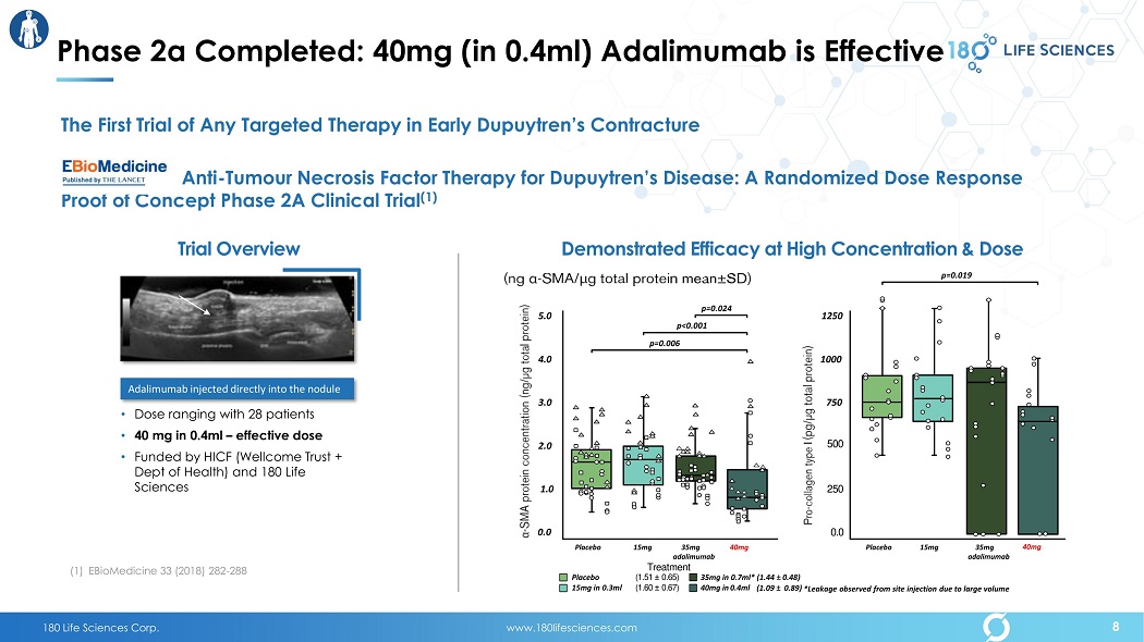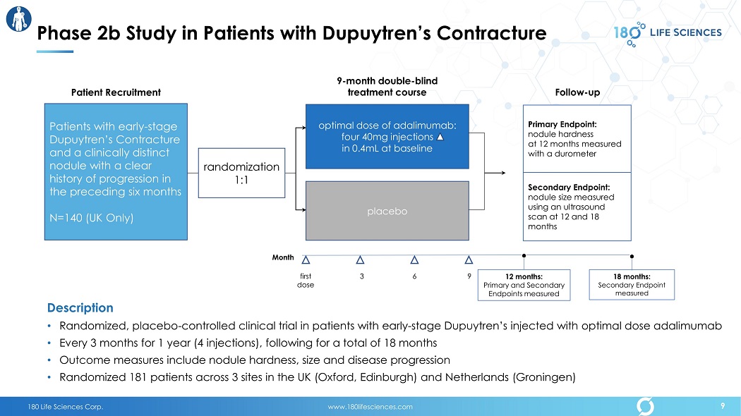 180 Life Sciences Corp. www.180lifesciences.com Phase 2a Completed: 40mg (in 0.4ml) Adalimumab is Effective • Dose ranging with 28 patients • 40 mg in 0.4ml – effective dose • Funded by HICF (Wellcome Trust + Dept of Health) and 180 Life Sciences Trial Overview Adalimumab injected directly into the nodule Demonstrated Efficacy at High C oncentration & D ose 15mg in 0.3ml (1.60 “ 0.67) 40mg in 0.4ml Placebo (1.51 “ 0.65) 35mg in 0.7ml* (1.44 “ 0.48) (1.09 “ 0.89) *Leakage observed from site injection due to large volume 5.0 4.0 3.0 2.0 1.0 0.0 Placebo 15mg 35mg 40mg a dalimumab Treatment p=0.024 p=0.006 p<0.001 1250 1000 750 500 250 0.0 Placebo 15mg 35mg 40mg a dalimumab p=0.019 The First Trial of Any Targeted Therapy in Early Dupuytren’s Contracture Anti - Tumour Necrosis Factor Therapy for Dupuytren’s Disease: A Randomized Dose Response Proof of Concept Phase 2A Clinical Trial (1) (1) EBioMedicine 33 (2018) 282 - 288 8