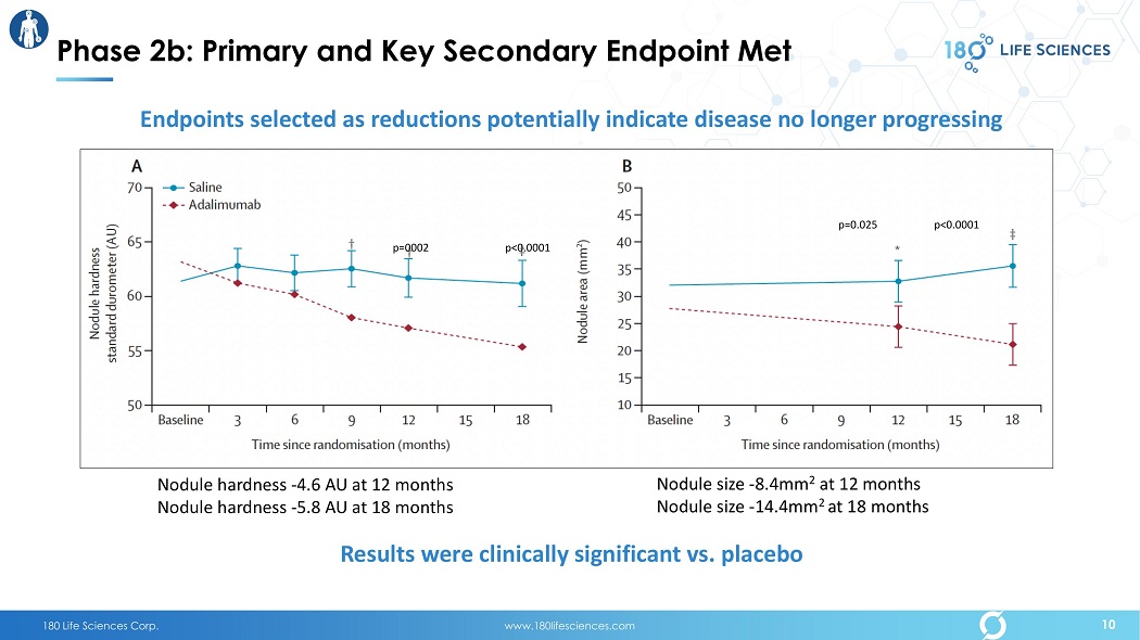 180 Life Sciences Corp. www.180lifesciences.com optimal dose of adalimumab: four 40mg injections in 0.4mL at baseline placebo Primary Endpoint: nodule hardness at 12 months measured with a durometer Month first dose 3 6 9 Secondary Endpoint: n odule size measured using an ultrasound scan at 12 and 18 months Follow - up 9 - month double - blind treatment course 12 months: Primary and Secondary Endpoints measured 18 months: Secondary Endpoint measured randomization 1:1 Patients with early - stage Dupuytren’s Contracture and a clinically distinct nodule with a clear history of progression in the preceding six months N=140 (UK Only) Patient Recruitment Description • Randomized, placebo - controlled clinical trial in patients with early - stage Dupuytren’s injected with optimal dose adalimumab • Every 3 months for 1 year (4 injections), following for a total of 18 months • Outcome measures include nodule hardness, size and disease progression • Randomized 181 patients across 3 sites in the UK (Oxford, Edinburgh) and Netherlands (Groningen) Phase 2b Study in Patients with Dupuytren’s Contracture 9