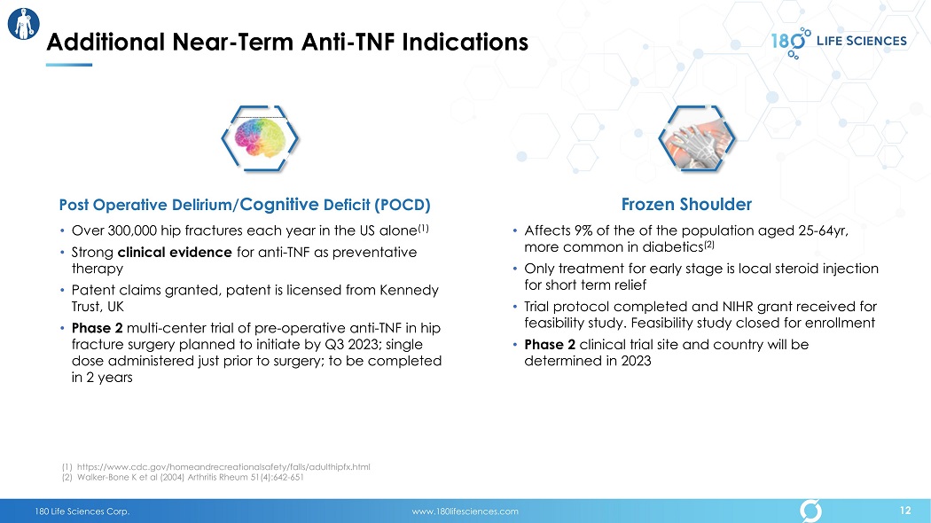 180 Life Sciences Corp. www.180lifesciences.com • Over 300,000 hip fractures each year in the US alone (1) • Strong clinical evidence for anti - TNF as preventative therapy • Patent claims granted, patent is licensed from Kennedy Trust, UK • Phase 2 multi - center trial of pre - operative anti - TNF in hip fracture surgery planned to initiate by Q3 2023; single dose administered just prior to surgery; to be completed in 2 years Post Operative Delirium/ Cognitive Deficit (POCD) Frozen Shoulder • Affects 9% of the of the population aged 25 - 64yr, more common in diabetics (2) • Only treatment for early stage is local steroid injection for short term relief • Trial protocol completed and NIHR grant received for feasibility study. Feasibility study closed for enrollment • Phase 2 clinical trial site and country will be determined in 2023 (1) https://www.cdc.gov/homeandrecreationalsafety/falls/adulthipfx.html (2) Walker - Bone K et al (2004) Arthritis Rheum 51(4):642 - 651 12 Additional Near - Term Anti - TNF Indications