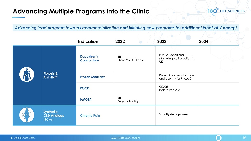 180 Life Sciences Corp. www.180lifesciences.com a7nAChR Family: Novel Platform for Ulcerative Colitis a7nAChR is a nicotine acetylcholine receptor and a central factor in evolutionarily ancient neural circuit to control of inflammation (1,2) (1) Rothbard JB et al. Identification of a common immune regulatory pathway induced by small heat shock proteins, amyloid fibrils, and nicotine. Proc Natl Acad Sci U S A. 2018 115:7081 - 7086. (2) Tracey KJ. Reflex control of immunity. Nat Rev Immunol. (2009) 9:418 – 28 14 • Large pharma initially touted a7 as a pharmaceutical target for Alzheimer’s disease and schizophrenia ⎯ Multiple specific agonists developed ⎯ All shown to be safe, but did not meet milestones in human clinical trials • 180 Life Sciences aims to repurpose a7nAChR for inflammation ⎯ Nicotine binds a7 and is a known immune suppressive ⎯ A subgroup of patients who cease smoking subsequently acquire ulcerative colitis (a large, growing market: 2012 - $4.2B; 2022 - $6.6B) ⎯ Treatment has a high probability of therapeutic success (can be viewed as nicotine replacement therapy without issues of addi cti on) × Capability to induce remission is quite low × Known deleterious side effects of steroids Existing Therapies Sub - Optimal × Long - term administration of thiopurine may correlate with increased risk of lymphoma × Cyclosporine leads to kidney damage × Serious adverse events, such as opportunistic infections, including tuberculosis, as well as congestive heart failure in cardiopathic patients Anti - inflammatory drugs (5 - aminosalicylates, corticosteroids) Immunosuppressants Infliximab (anti - TNF) x Fewer opportunistic infections x Reduced risk of kidney damage x Higher anticipated success rate a7nAChR Competitive Advantages Better safety and efficacy Faster time to market Lower development costs Novel therapeutic target Targeted clinical trial x Repurposing drugs previously proven safe (targeted Alzheimer’s & Schizophrenia) x Drugs stimulate vagal nerve, leading to localized anti - inflammatory response, similar to nicotine’s MoA x First clinical trial targeting patients who ceased smoking and developed ulcerative colitis