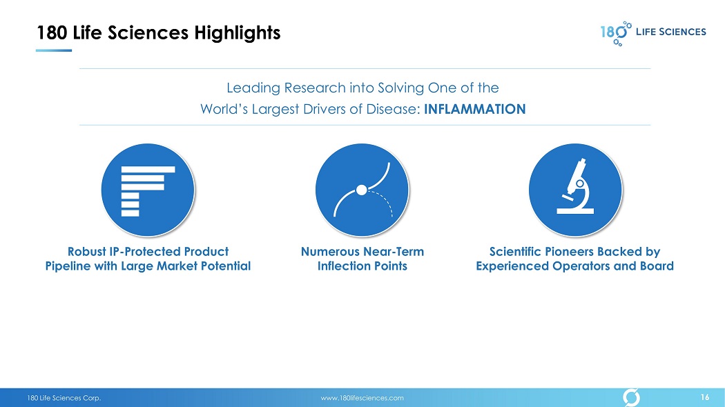 180 Life Sciences Corp. www.180lifesciences.com Advancing Multiple Programs into the Clinic Indication 2022 2023 2024 Fibrosis & Anti - TNF* Dupuytren’s Contracture 1H Phase 2b POC data Pursue Conditional Marketing Authorization in UK Frozen Shoulder Determine clinical trial site and country for Phase 2 POCD Q2/Q3 Initiate Phase 2 HMGB1 2H Begin validating Synthetic CBD Analogs (SCAs) Chronic Pain Toxicity study planned 15 Advancing lead program towards commercialization and initiating new programs for additional Proof - of - Concept