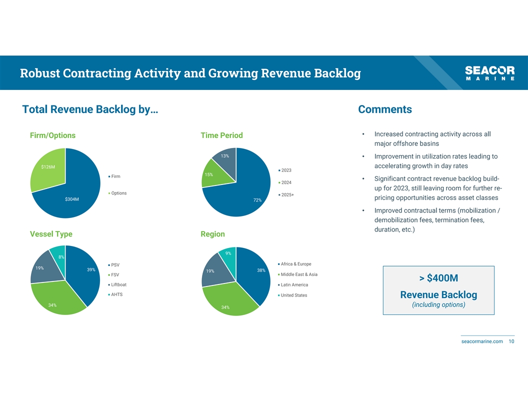 Revenue Diversification Across Geographies With a Reputable Customer Base (1) (2) 2022 Revenues Main Customers High-Quality Client Base Customer Name % of Revenues ExxonMobil 18% United States United States Saudi Aramco 14% $61M (primarily Gulf of Mexico) BP 7% (primarily Gulf of Mexico) ENI 5% APA Corporation 5% TotalEnergies 4% Chevron 4% Qatargas 3% Walter Oil & Gas 3% $44M Latin America Latin America ADNOC 3% Top 10 customers account for 66% of FY 2022 Revenues (3) Revenues by Customer Type $60M Africa & Europe Africa & Europe Offshore Other 4% Wind 3% Offshore Contractors 12% IOCs 40% NOCs 19% $53M Middle East & Asia Middle East & Asia Independents 22% (1) For the twelve months ended December 31, 2022. For continuing operations. Numbers in percentage of revenue per respective geography. (2) For 2022/2023. seacormarine.com 9 (3) For FY 2022.