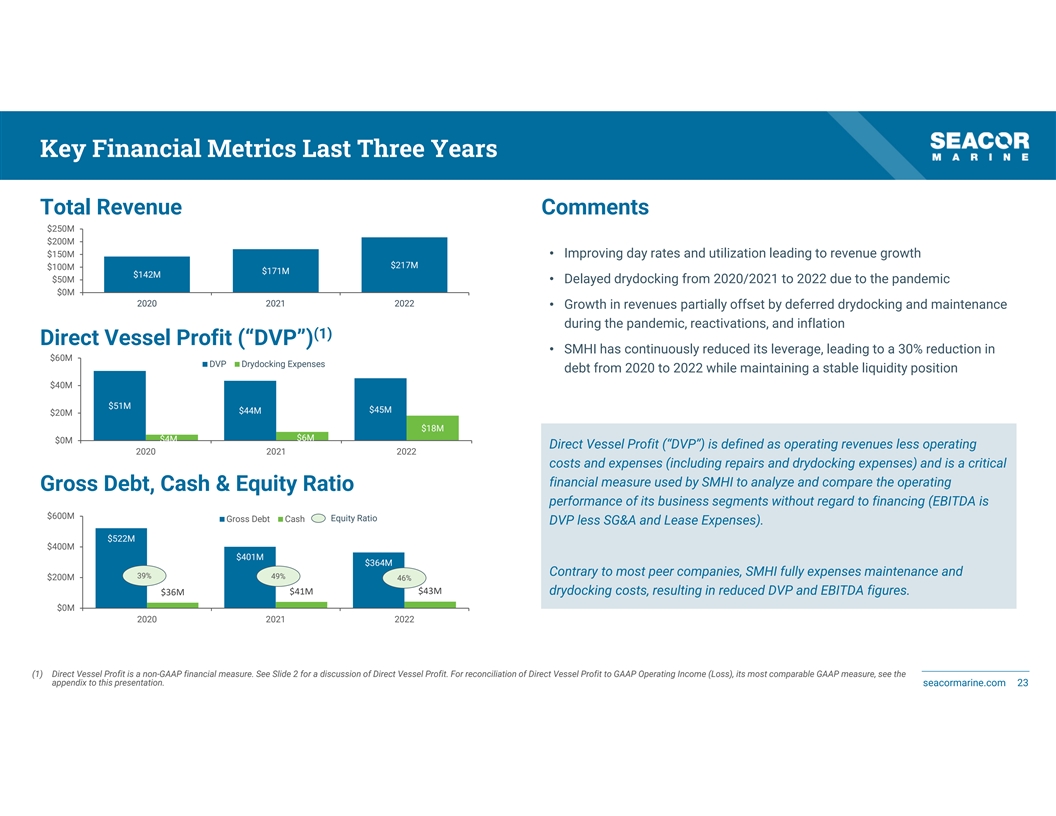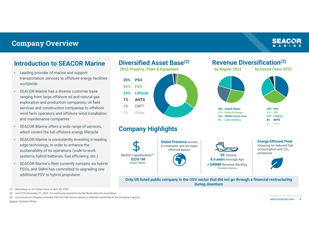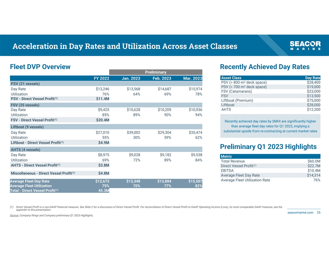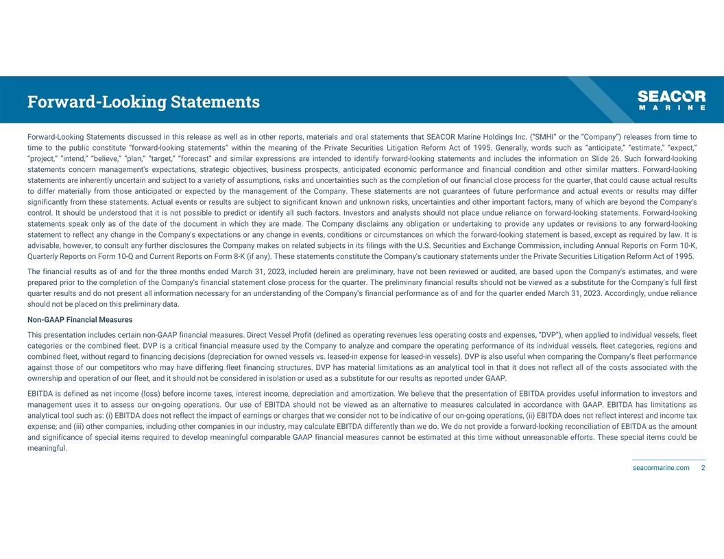 Forward-Looking Statements Forward-LookingStatementsdiscussedinthisreleaseaswellasinotherreports,materialsandoralstatementsthatSEACORMarineHoldingsInc.(“SMHI”orthe“Company”)releasesfromtimeto time to the public constitute “forward-looking statements” within the meaning of the Private Securities Litigation Reform Act of 1995. Generally, words such as “anticipate,” “estimate,” “expect,” “project,” “intend,” “believe,” “plan,” “target,” “forecast” and similar expressions are intended to identify forward-looking statements and includes the information on Slide 26. Such forward-looking statements concern management's expectations, strategic objectives, business prospects, anticipated economic performance and financial condition and other similar matters. Forward-looking statementsareinherentlyuncertainandsubjecttoavarietyofassumptions,risksanduncertaintiessuchasthecompletionofourfinancialcloseprocessforthequarter,thatcouldcauseactualresults to differ materially from those anticipated or expected by the management of the Company. These statements are not guarantees of future performance and actual events or results may differ significantlyfromthesestatements.Actualeventsorresultsaresubjecttosignificantknownandunknownrisks,uncertaintiesandotherimportantfactors,manyofwhicharebeyondtheCompany's control.Itshouldbeunderstoodthatitisnotpossibletopredictoridentifyallsuchfactors.Investorsandanalystsshouldnotplaceunduerelianceonforward-lookingstatements.Forward-looking statements speak only as of the date of the document in which they are made. The Company disclaims any obligation or undertaking to provide any updates or revisions to any forward-looking statementtoreflectanychangeintheCompany'sexpectationsoranychangeinevents,conditionsorcircumstancesonwhichtheforward-lookingstatementisbased,exceptasrequiredbylaw.Itis advisable,however,toconsultanyfurtherdisclosurestheCompanymakesonrelatedsubjectsinitsfilingswiththeU.S.SecuritiesandExchangeCommission,includingAnnualReportsonForm10-K, QuarterlyReportsonForm10-QandCurrentReportsonForm8-K(ifany).ThesestatementsconstitutetheCompany'scautionarystatementsunderthePrivateSecuritiesLitigationReformActof1995. ThefinancialresultsasofandforthethreemonthsendedMarch31,2023,includedhereinarepreliminary,havenotbeenreviewedoraudited,arebasedupontheCompany'sestimates,andwere preparedpriortothecompletionoftheCompany'sfinancialstatementcloseprocessforthequarter.ThepreliminaryfinancialresultsshouldnotbeviewedasasubstitutefortheCompany’sfullfirst quarterresultsanddonotpresentallinformationnecessaryforanunderstandingoftheCompany’sfinancialperformanceasofandforthequarterendedMarch31,2023.Accordingly,unduereliance shouldnotbeplacedonthispreliminarydata. Non-GAAPFinancialMeasures Thispresentationincludescertainnon-GAAPfinancialmeasures.DirectVesselProfit(definedasoperatingrevenueslessoperatingcostsandexpenses,“DVP”),whenappliedtoindividualvessels,fleet categoriesorthecombinedfleet.DVPisacriticalfinancialmeasureusedbytheCompanytoanalyzeandcomparetheoperatingperformanceofitsindividualvessels,fleetcategories,regionsand combinedfleet,withoutregardtofinancingdecisions(depreciationforownedvesselsvs.leased-inexpenseforleased-invessels).DVPisalsousefulwhencomparingtheCompany’sfleetperformance againstthoseofourcompetitorswhomayhavedifferingfleetfinancingstructures.DVPhasmateriallimitationsasan analyticaltoolinthatitdoesnotreflectallofthecostsassociatedwiththe ownershipandoperationofourfleet,anditshouldnotbeconsideredinisolationorusedasasubstituteforourresultsasreportedunderGAAP. EBITDAisdefinedasnetincome(loss)beforeincometaxes,interestincome,depreciationandamortization.WebelievethatthepresentationofEBITDAprovidesusefulinformationtoinvestorsand management uses it to assess our on-going operations. Our use of EBITDA should not be viewed as an alternative to measures calculated in accordance with GAAP. EBITDA has limitations as analyticaltoolsuchas:(i)EBITDAdoesnotreflecttheimpactofearningsorchargesthatweconsidernottobeindicativeofouron-goingoperations,(ii)EBITDAdoesnotreflectinterestandincometax expense;and(iii)othercompanies,includingothercompaniesinourindustry,maycalculateEBITDAdifferentlythanwedo.Wedonotprovideaforward-lookingreconciliationofEBITDAastheamount andsignificanceofspecialitemsrequiredtodevelopmeaningfulcomparableGAAPfinancialmeasurescannotbeestimatedatthistimewithoutunreasonableefforts.Thesespecialitemscouldbe meaningful. seacormarine.com 2