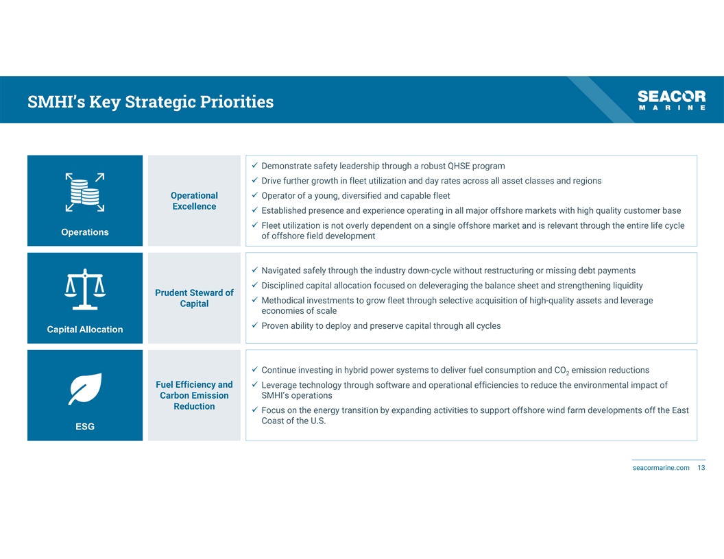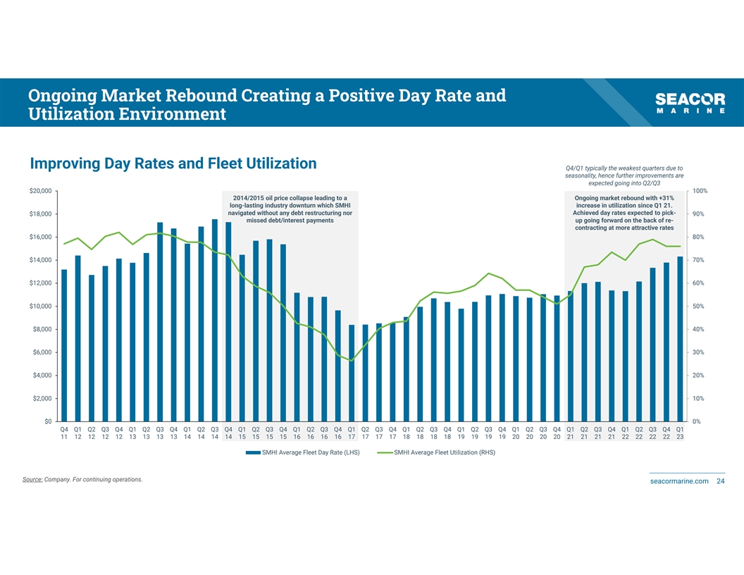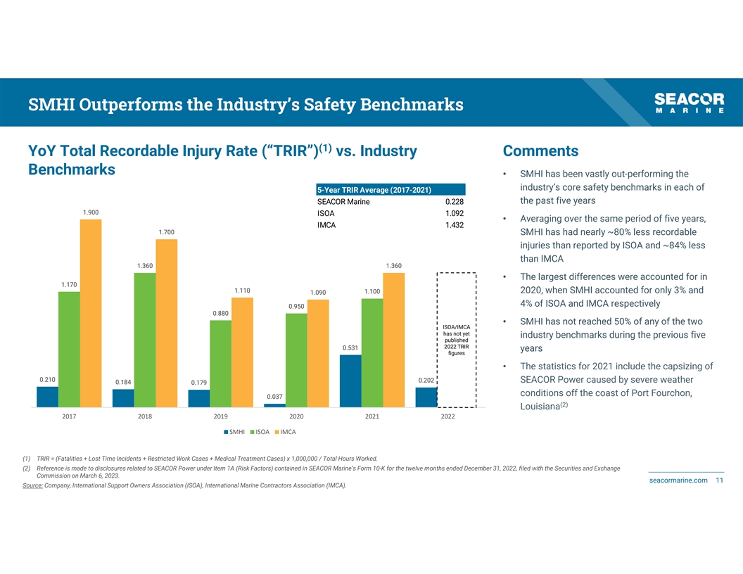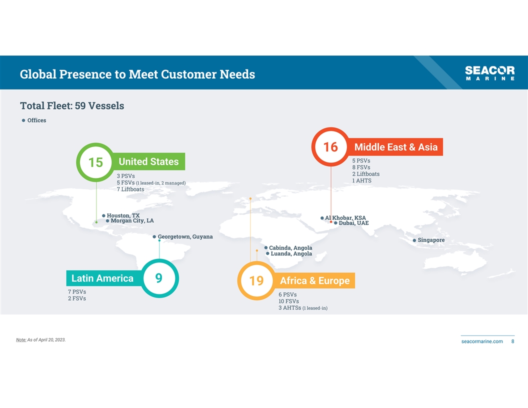 Forward-Looking Statements Forward-LookingStatementsdiscussedinthisreleaseaswellasinotherreports,materialsandoralstatementsthatSEACORMarineHoldingsInc.(“SMHI”orthe“Company”)releasesfromtimeto time to the public constitute “forward-looking statements” within the meaning of the Private Securities Litigation Reform Act of 1995. Generally, words such as “anticipate,” “estimate,” “expect,” “project,” “intend,” “believe,” “plan,” “target,” “forecast” and similar expressions are intended to identify forward-looking statements and includes the information on Slide 26. Such forward-looking statements concern management's expectations, strategic objectives, business prospects, anticipated economic performance and financial condition and other similar matters. Forward-looking statementsareinherentlyuncertainandsubjecttoavarietyofassumptions,risksanduncertaintiessuchasthecompletionofourfinancialcloseprocessforthequarter,thatcouldcauseactualresults to differ materially from those anticipated or expected by the management of the Company. These statements are not guarantees of future performance and actual events or results may differ significantlyfromthesestatements.Actualeventsorresultsaresubjecttosignificantknownandunknownrisks,uncertaintiesandotherimportantfactors,manyofwhicharebeyondtheCompany's control.Itshouldbeunderstoodthatitisnotpossibletopredictoridentifyallsuchfactors.Investorsandanalystsshouldnotplaceunduerelianceonforward-lookingstatements.Forward-looking statements speak only as of the date of the document in which they are made. The Company disclaims any obligation or undertaking to provide any updates or revisions to any forward-looking statementtoreflectanychangeintheCompany'sexpectationsoranychangeinevents,conditionsorcircumstancesonwhichtheforward-lookingstatementisbased,exceptasrequiredbylaw.Itis advisable,however,toconsultanyfurtherdisclosurestheCompanymakesonrelatedsubjectsinitsfilingswiththeU.S.SecuritiesandExchangeCommission,includingAnnualReportsonForm10-K, QuarterlyReportsonForm10-QandCurrentReportsonForm8-K(ifany).ThesestatementsconstitutetheCompany'scautionarystatementsunderthePrivateSecuritiesLitigationReformActof1995. ThefinancialresultsasofandforthethreemonthsendedMarch31,2023,includedhereinarepreliminary,havenotbeenreviewedoraudited,arebasedupontheCompany'sestimates,andwere preparedpriortothecompletionoftheCompany'sfinancialstatementcloseprocessforthequarter.ThepreliminaryfinancialresultsshouldnotbeviewedasasubstitutefortheCompany’sfullfirst quarterresultsanddonotpresentallinformationnecessaryforanunderstandingoftheCompany’sfinancialperformanceasofandforthequarterendedMarch31,2023.Accordingly,unduereliance shouldnotbeplacedonthispreliminarydata. Non-GAAPFinancialMeasures Thispresentationincludescertainnon-GAAPfinancialmeasures.DirectVesselProfit(definedasoperatingrevenueslessoperatingcostsandexpenses,“DVP”),whenappliedtoindividualvessels,fleet categoriesorthecombinedfleet.DVPisacriticalfinancialmeasureusedbytheCompanytoanalyzeandcomparetheoperatingperformanceofitsindividualvessels,fleetcategories,regionsand combinedfleet,withoutregardtofinancingdecisions(depreciationforownedvesselsvs.leased-inexpenseforleased-invessels).DVPisalsousefulwhencomparingtheCompany’sfleetperformance againstthoseofourcompetitorswhomayhavedifferingfleetfinancingstructures.DVPhasmateriallimitationsasan analyticaltoolinthatitdoesnotreflectallofthecostsassociatedwiththe ownershipandoperationofourfleet,anditshouldnotbeconsideredinisolationorusedasasubstituteforourresultsasreportedunderGAAP. EBITDAisdefinedasnetincome(loss)beforeincometaxes,interestincome,depreciationandamortization.WebelievethatthepresentationofEBITDAprovidesusefulinformationtoinvestorsand management uses it to assess our on-going operations. Our use of EBITDA should not be viewed as an alternative to measures calculated in accordance with GAAP. EBITDA has limitations as analyticaltoolsuchas:(i)EBITDAdoesnotreflecttheimpactofearningsorchargesthatweconsidernottobeindicativeofouron-goingoperations,(ii)EBITDAdoesnotreflectinterestandincometax expense;and(iii)othercompanies,includingothercompaniesinourindustry,maycalculateEBITDAdifferentlythanwedo.Wedonotprovideaforward-lookingreconciliationofEBITDAastheamount andsignificanceofspecialitemsrequiredtodevelopmeaningfulcomparableGAAPfinancialmeasurescannotbeestimatedatthistimewithoutunreasonableefforts.Thesespecialitemscouldbe meaningful. seacormarine.com 2