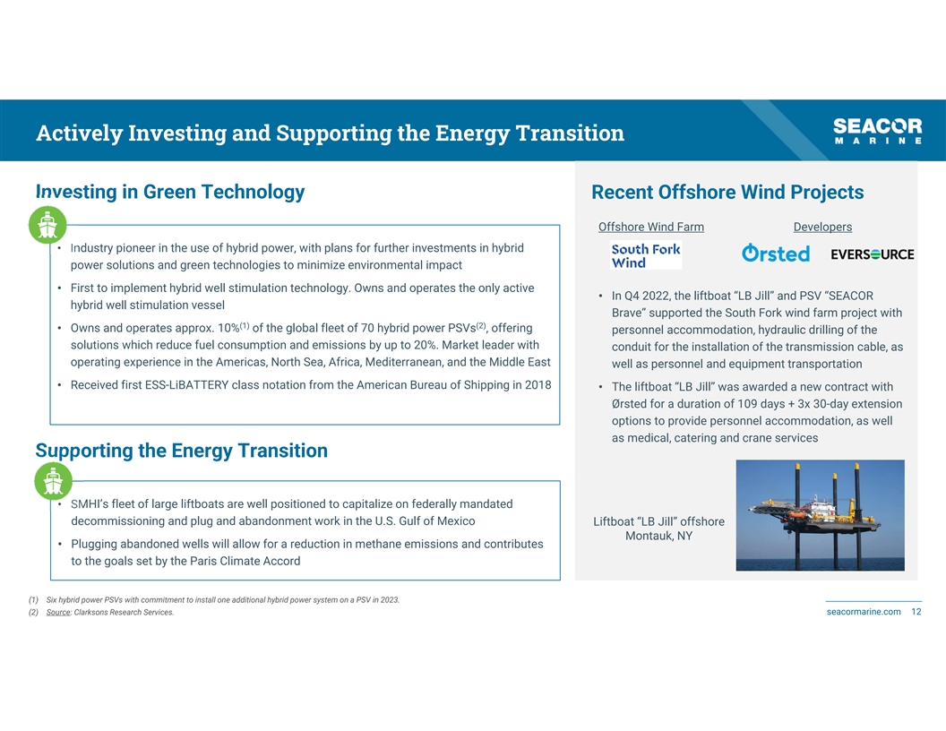 SMHI Outperforms the Industry’s Safety Benchmarks (1) YoY Total Recordable Injury Rate (“TRIR”) vs. Industry Comments Benchmarks • SMHI has been vastly out-performing the industry’s core safety benchmarks in each of 5-Year TRIR Average (2017-2021) the past five years SEACOR Marine 0.228 1.900 ISOA 1.092 • Averaging over the same period of five years, IMCA 1.432 1.700 SMHI has had nearly ~80% less recordable injuries than reported by ISOA and ~84% less than IMCA 1.360 1.360 • The largest differences were accounted for in 1.170 1.110 1.100 2020, when SMHI accounted for only 3% and 1.090 4% of ISOA and IMCA respectively 0.950 0.880 • SMHI has not reached 50% of any of the two ISOA/IMCA has not yet industry benchmarks during the previous five published 2022 TRIR 0.531 years figures • The statistics for 2021 include the capsizing of 0.210 0.202 SEACOR Power caused by severe weather 0.184 0.179 conditions off the coast of Port Fourchon, 0.037 (2) Louisiana 2017 2018 2019 2020 2021 2022 SMHI ISOA IMCA (1) TRIR = (Fatalities + Lost Time Incidents + Restricted Work Cases + Medical Treatment Cases) x 1,000,000 / Total Hours Worked. (2) Reference is made to disclosures related to SEACOR Power under Item 1A (Risk Factors) contained in SEACOR Marine’s Form 10-K for the twelve months ended December 31, 2022, filed with the Securities and Exchange Commission on March 6, 2023. seacormarine.com 11 Source: Company, International Support Owners Association (ISOA), International Marine Contractors Association (IMCA).