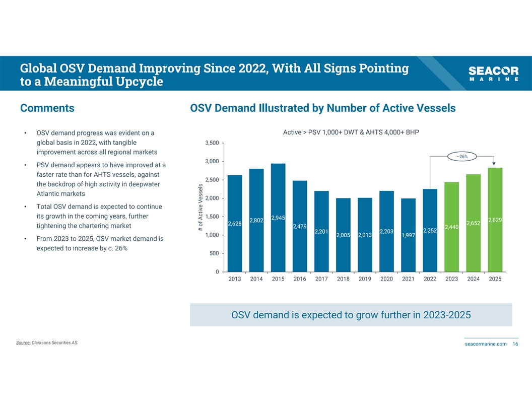 Well Positioned To Capitalize on the Rebounding Offshore Market Offshore Capex by Region OSV Fleet Growth OSV Day Rates 350 45,000 200 350 14 % 300 12 % 180 40,000 300 250 10 % 160 35,000 250 200 8 % 140 ~65% 30,000 150 6 % 120 200 25,000 100 4 % 100 20,000 150 50 2 % 80 15,000 - - 60 100 (50) (2 %) 10,000 40 50 (100) (4 %) 5,000 20 (150) (6 %) - 0 0 AHTS Attrition & Conversion PSV Attrition & Conversion Asia-Pacific Middle East Africa PSV 4,000 dwt TC Rate, Global Indicator AHTS Deliveries PSV Deliveries OSV Rate Index (RHS) Latin America North America Europe Fleet growth (rhs) Increased offshore activity and limited supply of vessels create favorable market conditions Source: Clarksons Securities AS. seacormarine.com 15 $bn 2010 2011 2012 2013 2014 2015 2016 2017 2018 2019 2020 2021 2022 2023 2024 # Units 2007 2008 2009 2010 2011 2012 2013 2014 2015 2016 2017 2018 2019 2020 2021 2022 $k/day 2007 2008 2009 2010 2011 2012 2013 2014 2015 2016 2017 2018 2019 2020 2021 2022 2023 OSV Rate Index